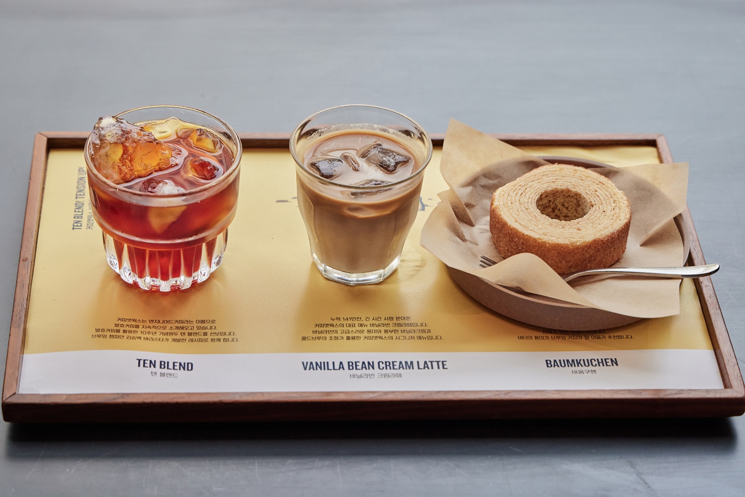 ‘텐 블렌드 브루잉 커피’는 전용 잔과 포트가, ‘10주년 플래터’는 ‘텐 블렌드 브루잉 커피’와 ‘바닐라빈 크림라떼’, 구움 과자 ‘바움쿠헨’으로 구성된 메뉴입니다. 김승백 바리스타는 순도 높게 커피를 감상하는 팁으로 먼저 커피를 맛본 후 바닐라빈 크림라떼, 바움쿠헨을 차례로 곁들이라고 일러주었습니다.