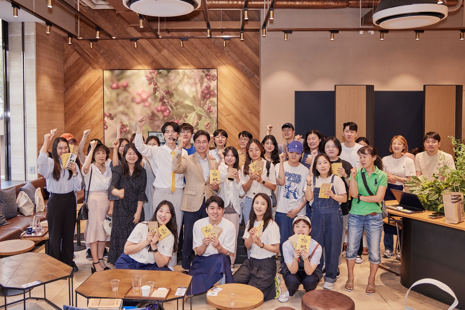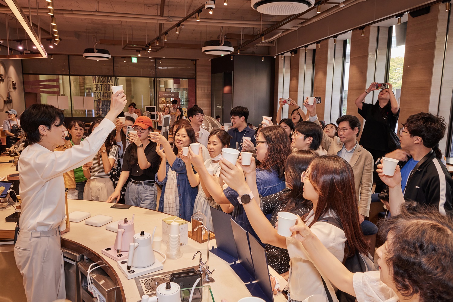 커피 강좌에 이어 김승백 바리스타와 세미나 참가자들은 브루잉 바로 자리를 옮겼습니다. 세미나를 듣고 난 뒤 소중한 자신의 취향에 맞는 커피를 고민하게 된 참가자들은 사뭇 달라진 눈빛과 태도로 원두의 향을 맡고, 갓 추출한 커피를 음미했습니다. 달콤하고 향긋한 귀한 커피를 함께 즐긴 만큼 단체 사진을 남기는 것도 잊지 않았고요.