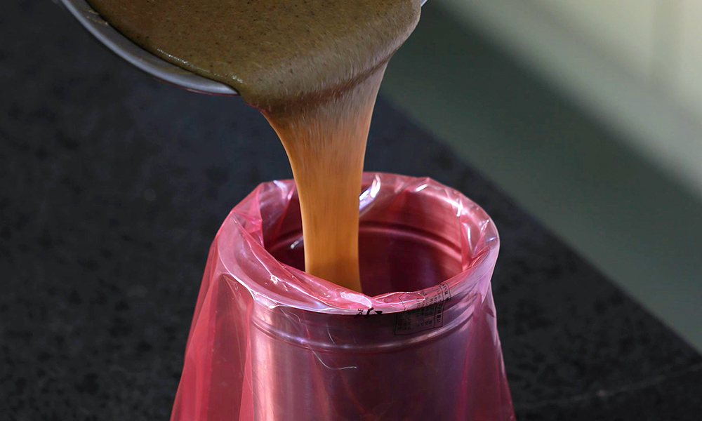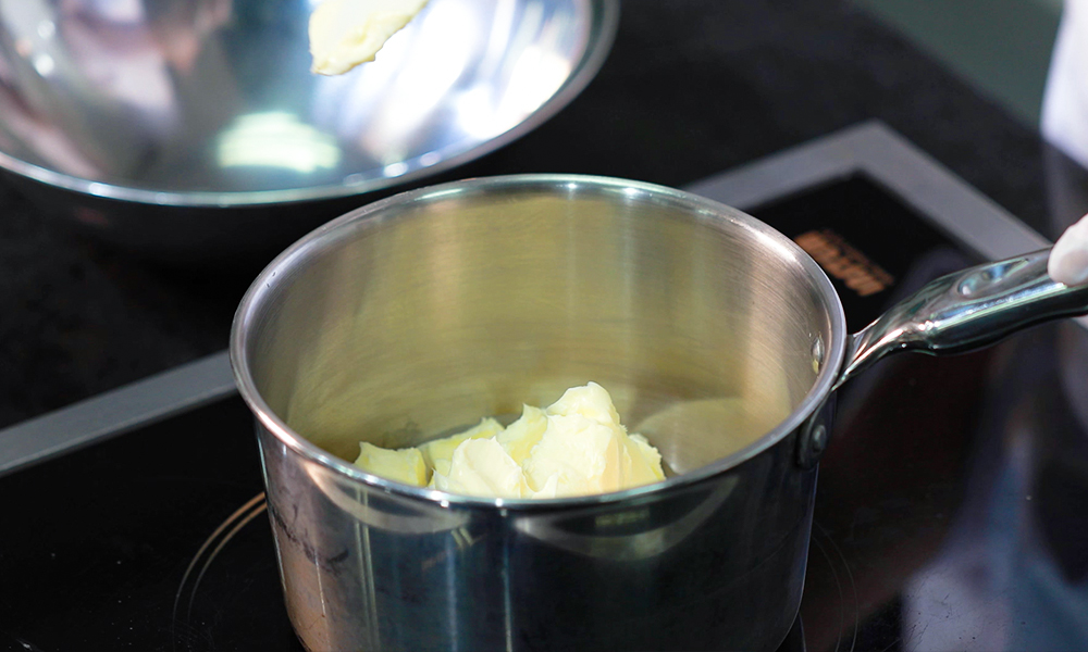 1. 버터의 수분이 날아갈 때까지 태우듯 가열한 후 체에 걸러주세요. 거른 버터는 반죽이 익거나 기름이 새는 것을 막기 위해 50℃까지 식혀주세요.