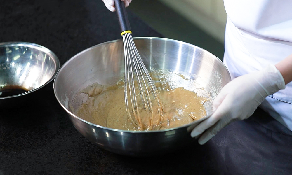 3. 반죽에 식힌 누아젯 버터를 넣고 부드럽게 섞은 후, 짤주머니에 반죽을 붓습니다.