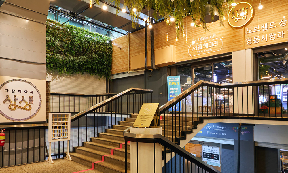 한약상가라고 불리던 ‘경동시장’은 2019년 청년몰 입점을 시작으로 세대를 아우르는 문화공간으로 탈바꿈했습니다. 시장 3층은 ‘서울훼미리’라는 이름으로 청년들이 운영하는 핫한 음식점과 공방 등으로 조성하고, 2층엔 작은 도서관과 카페를 만들어 방문객이 쉬었다 갈 수 있도록 했는데요. 장 보는 동안 어린 자녀를 맡길 수 있는 놀이터는 물론이고, 반려견을 위한 놀이터와 호텔까지 갖추어 ‘펫팸족’의 마음을 사로잡고 있습니다.