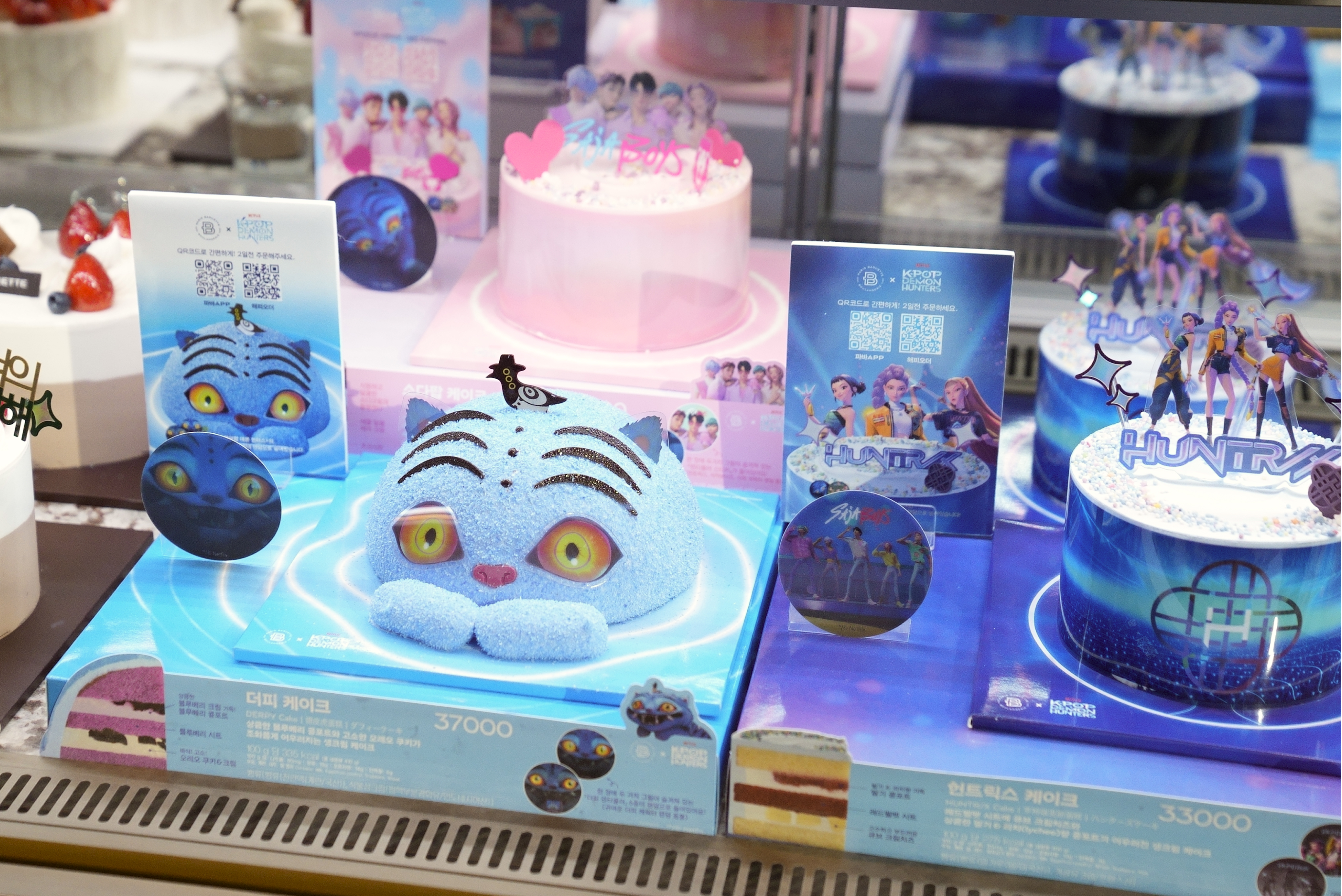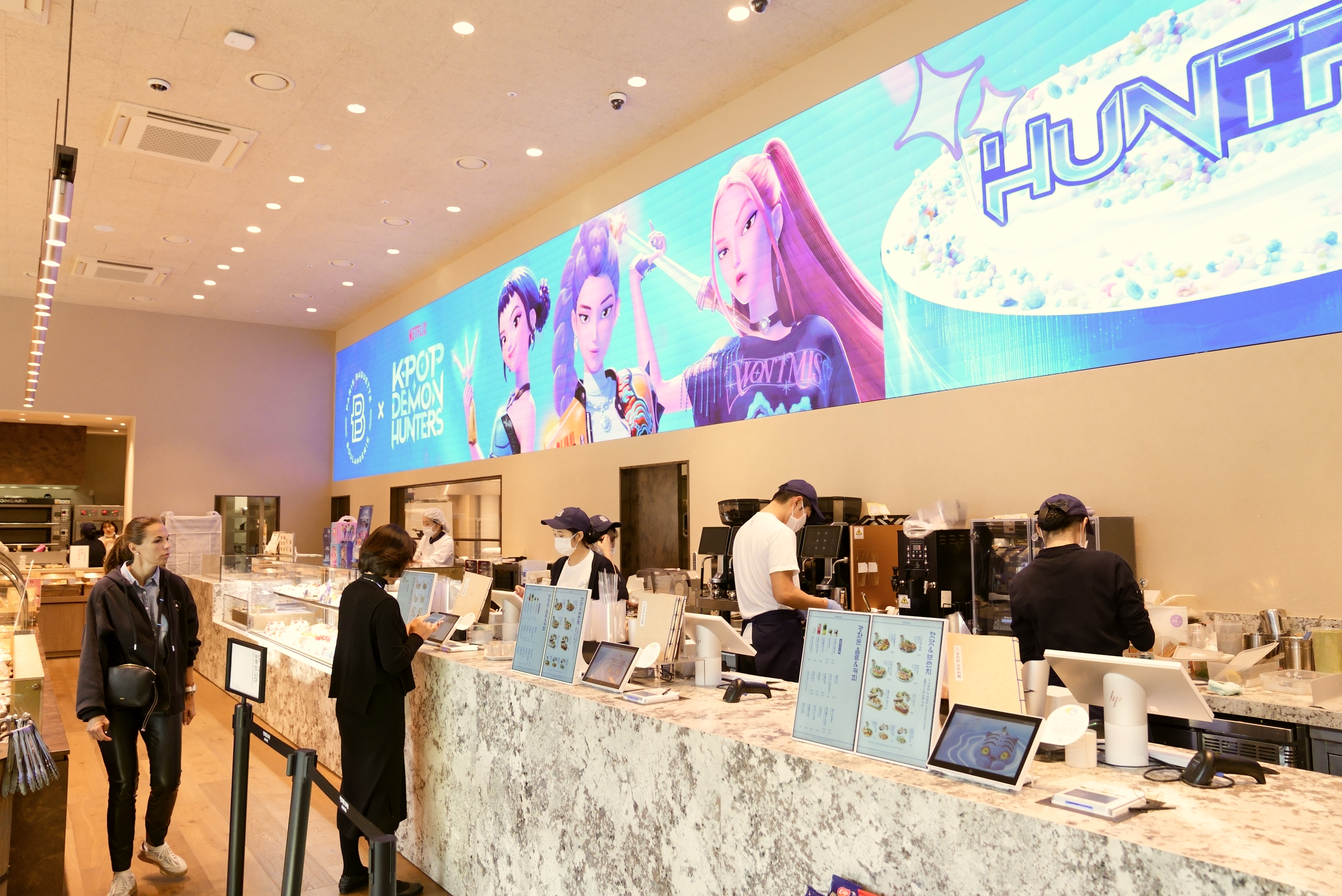 또, 매장 입구 전면에는 넷플릭스의 인기작 <케이팝 데몬헌터스> 캐릭터 ‘더피’와 ‘서씨’가 큼직하게 붙어 있어 지나가는 이들의 시선을 끌었습니다. 입구에서부터 이곳이 특별한 매장이라는 인식을 심어주기에 충분했습니다.