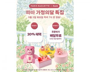 이날 방송을 통해 파리바게뜨는 어린이와 어른의 취향을 모두 만족시키는 귀여운 캐릭터 케이크, 5월 각종 기념일을 맞이해 마음을 전달할 수 있도록 국내 유명 플로리스트 ‘오드리(Audrey)’와 협업한 선물세트, 홈파티 분위기 연출을 위한 케이크 제품, 정성을 담은 정갈한 선물세트, 파리바게뜨 간편식 브랜드인 ‘퍼스트 클래스 키친’ 인기 제품 등 다양한 제품을 선보일 예정이다.