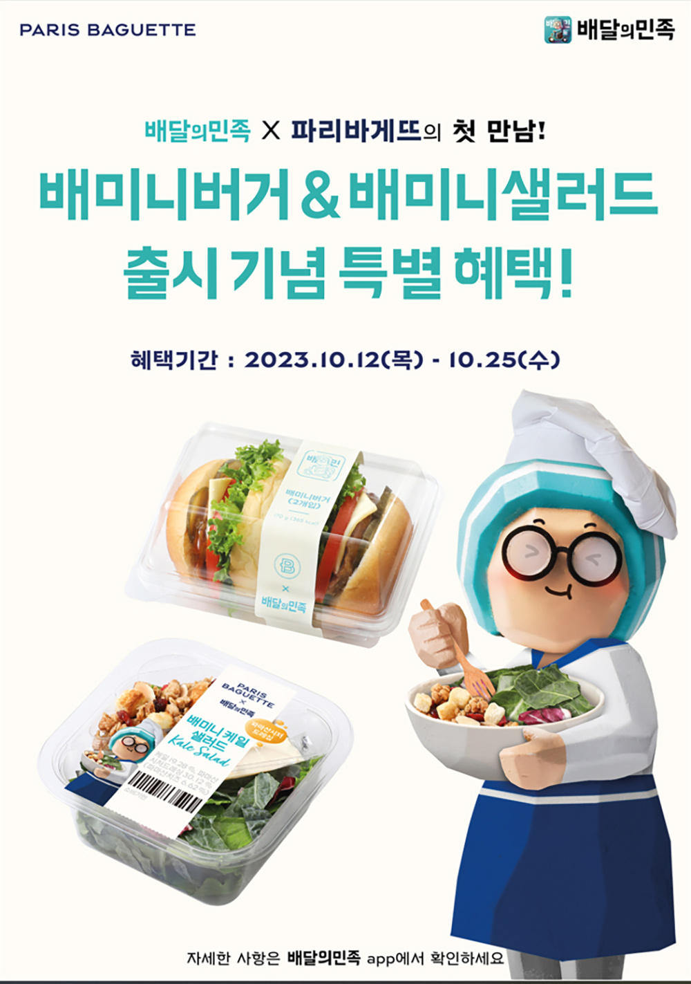 파리바게뜨는 이번 협업을 기념해 다양한 행사를 선보인다. 먼저, 9일부터 11일까지 배달의민족 앱에서 파리바게뜨 브랜드 찜하기를 누르면 전 메뉴 3천원 혜택을 제공하는 사전 프로모션을 진행한다.