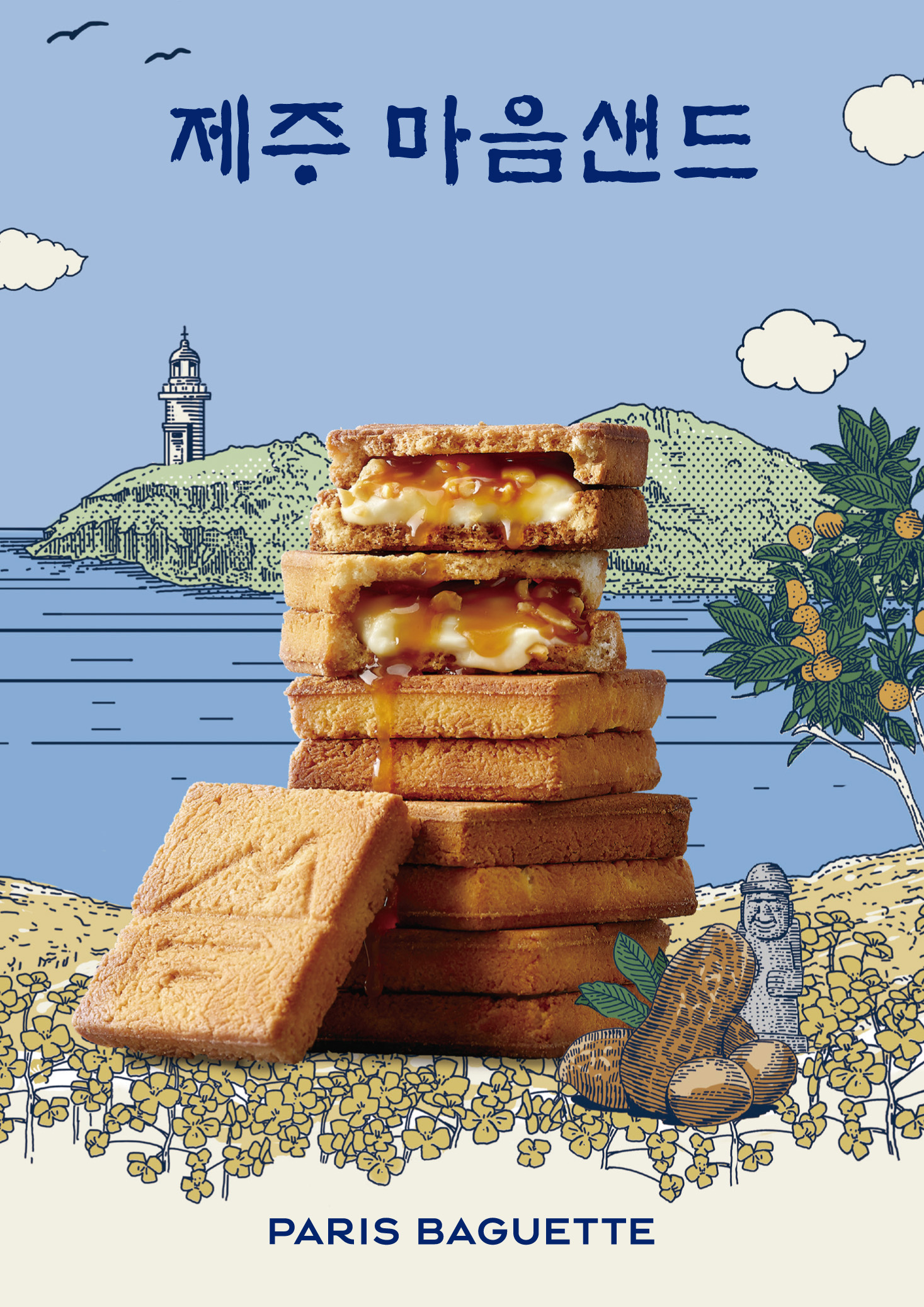 ‘제주마음샌드’는 바삭바삭한 쿠키 사이에 땅콩, 버터, 캐러멜 등을 조화시킨 제품이다. 제주의 해풍을 담은 우도 땅콩을 원료로 사용해 더욱 진하고 고소한 풍미를 느낄 수 있다. 제주를 상징하는 이미지를 음각으로 새겨 넣어 선물용으로도 좋다.