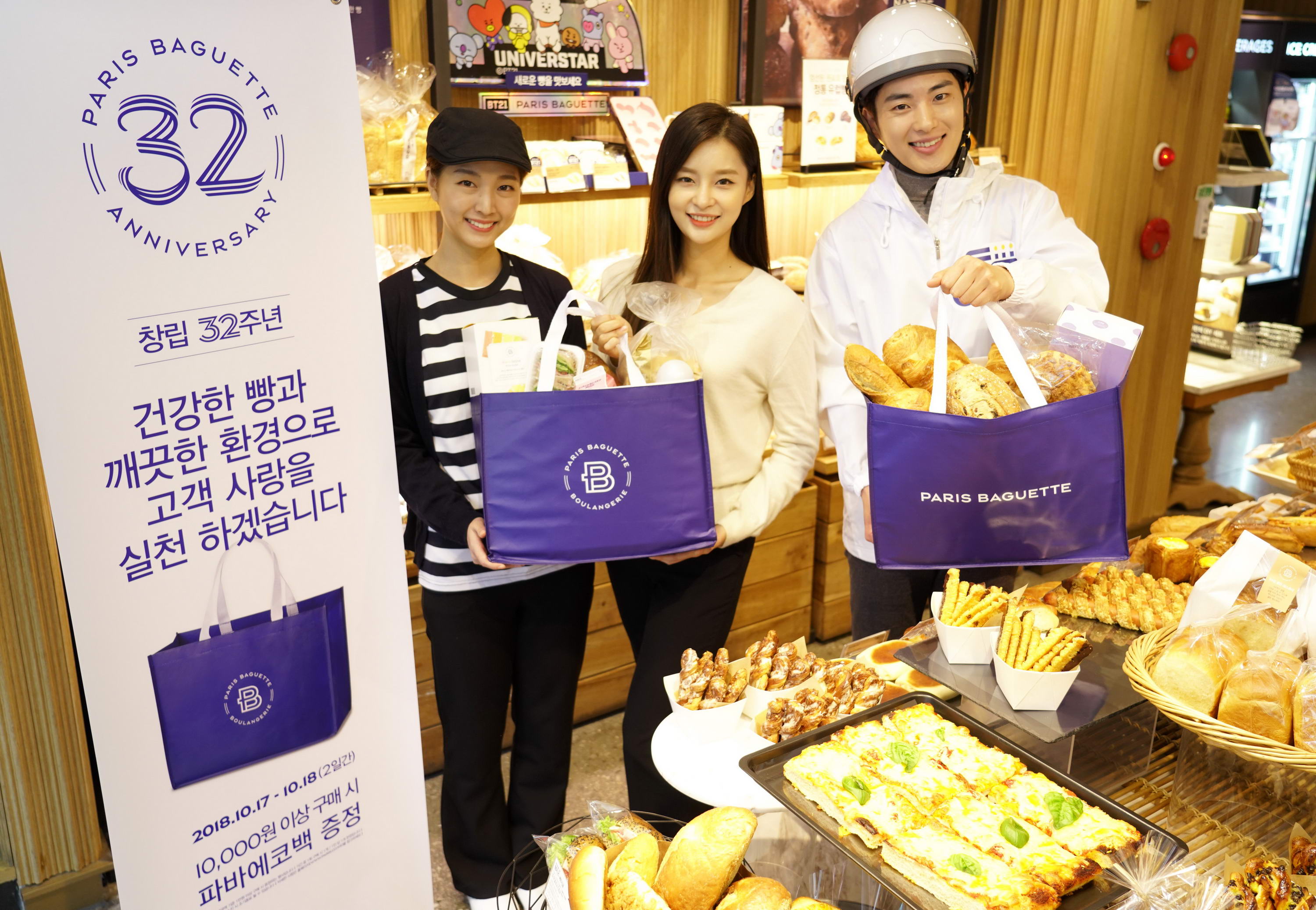 이번 행사는 파리바게뜨를 운영하는 ㈜파리크라상의 창립 32주년(10월 17일)을 맞아 기획한 것이다. 10월 17일부터 18일까지 이틀 동안 전국 파리바게뜨 매장서 제품 구매 시 결제 최종 금액이 1만원 이상인 경우 장바구니인 ‘파바 에코백’을 증정한다. (1인당 1개 한정, 재고 소진 시까지)