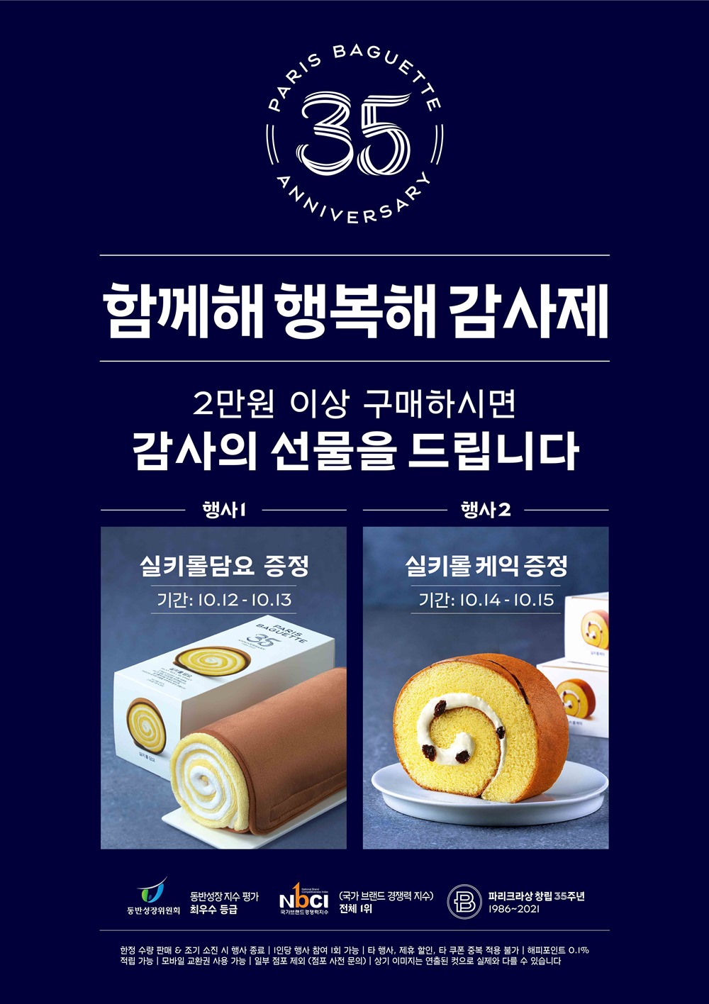 ‘함께해 행복해 감사제’라는 슬로건으로 진행되는 이번 행사는 파리바게뜨가 고객들과 함께 성장한 지난 35년을 기념해 감사의 마음을 담아 특별한 선물로 보답한다는 의미를 담았다.