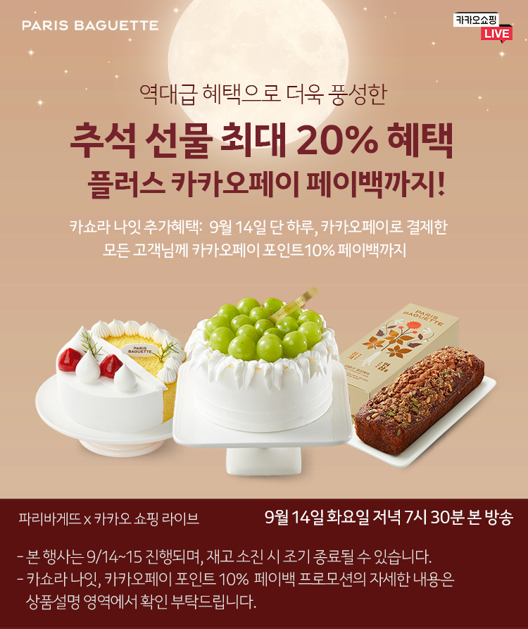 파리바게뜨가 다가오는 추석을 맞아 카카오커머스에서 운영하는 ‘카카오쇼핑라이브’에서 케이크와 선물세트 등을 소개하고 풍성한 혜택도 전한다고 13일 밝혔다.