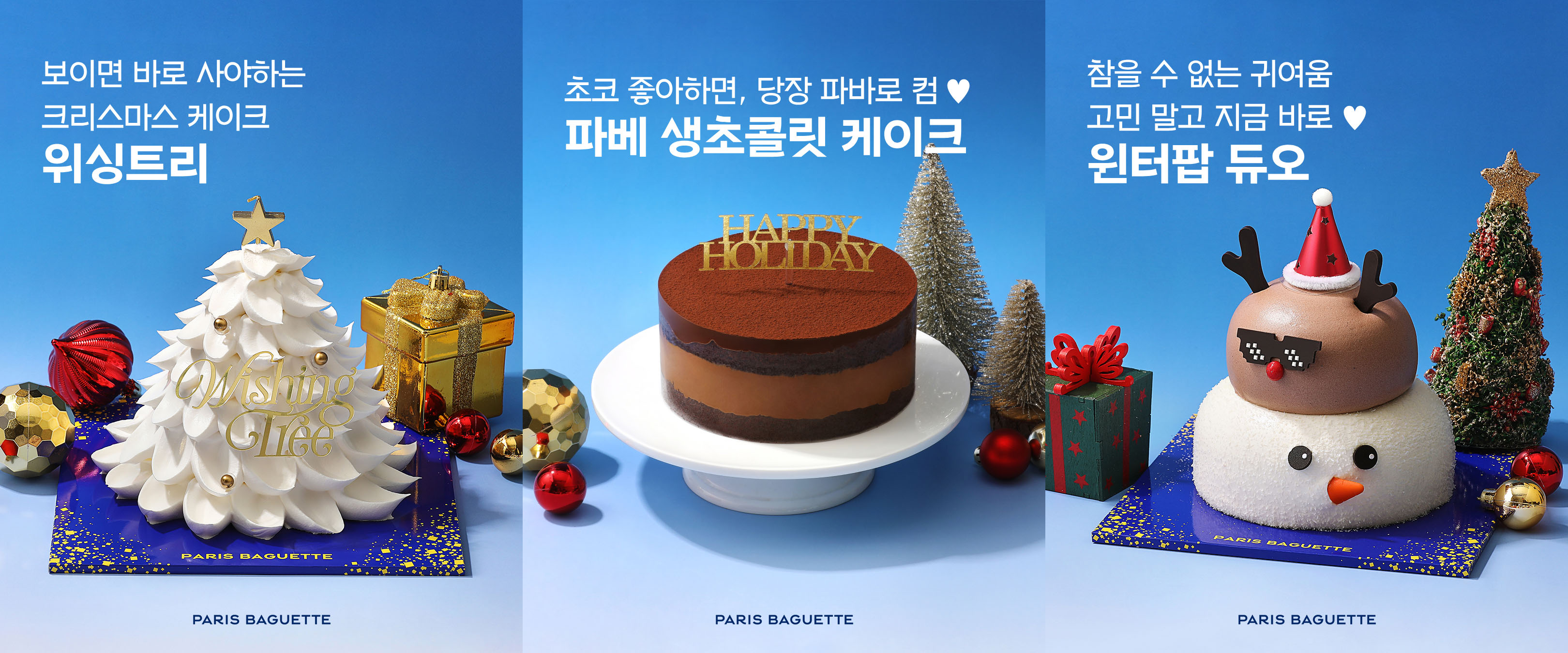 크리스마스와 연말 분위기를 한층 더해줄 홀리데이 시즌 케이크 9종도 좋은 선택이다. 크리스마스를 근사하게 완성할 비주얼 케이크로 새하얀 생크림 트리 위에 반짝이는 골드 장식을 더한 ‘위싱트리’, 진한 생 초콜릿 무스와 묵직한 식감의 초코 시트의 조합으로 초콜릿 마니아들의 마음을 사로잡는 ‘파베 생초콜릿 케이크’, 귀여운 눈사람과 루돌프가 함께 있는 두 가지 맛의 2단 버터 케이크 ‘윈터팝 듀오(루돌프와 눈사람)’ 등이 있다.