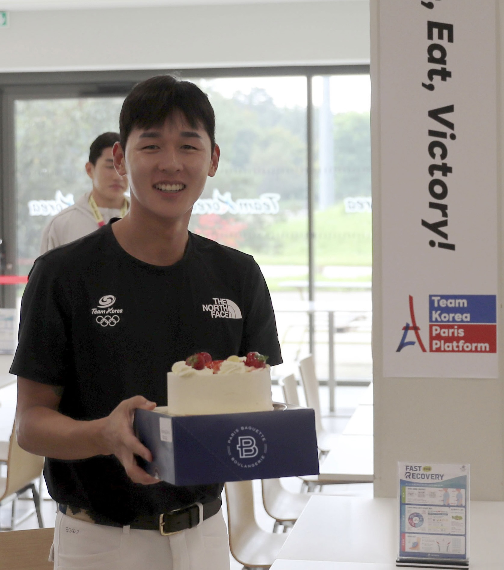 파리바게뜨는 현지 시각 4일 프랑스 파리 코리아하우스에서 열린 대한민국 국가대표 메달리스트 기자회견에서 행사에 참석한 펜싱, 유도, 사격 선수들에게 케이크를 전달했다.