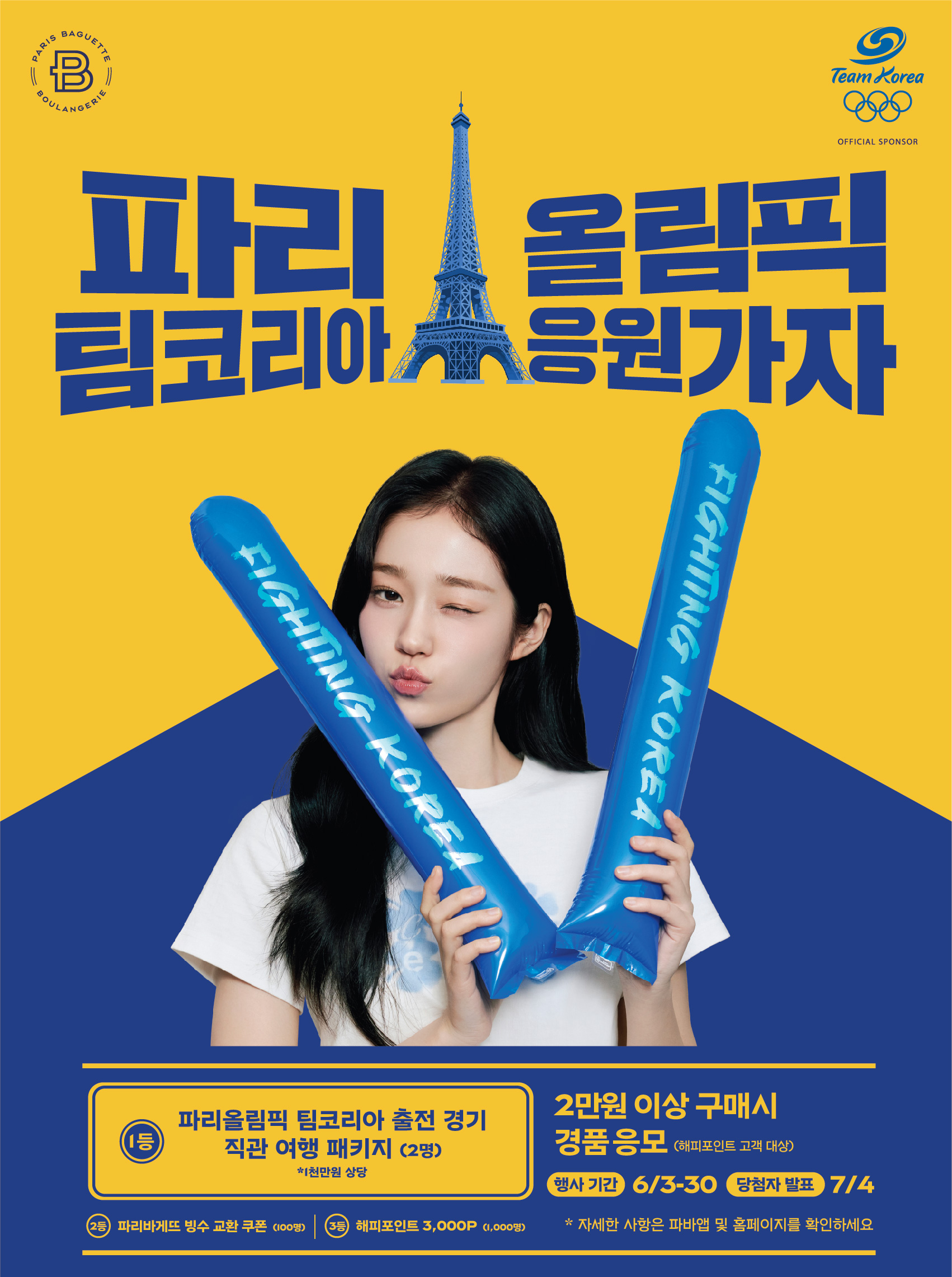 이 이벤트는 파리바게뜨와 국가대표 선수단 ‘팀코리아(Team Korea)’의 공식 후원 협약 체결을 기념해 진행되는 첫 행사로, 파리올림픽을 앞둔 팀코리아를 응원하고 소비자들에게 특별한 혜택을 제공하고자 마련됐다.