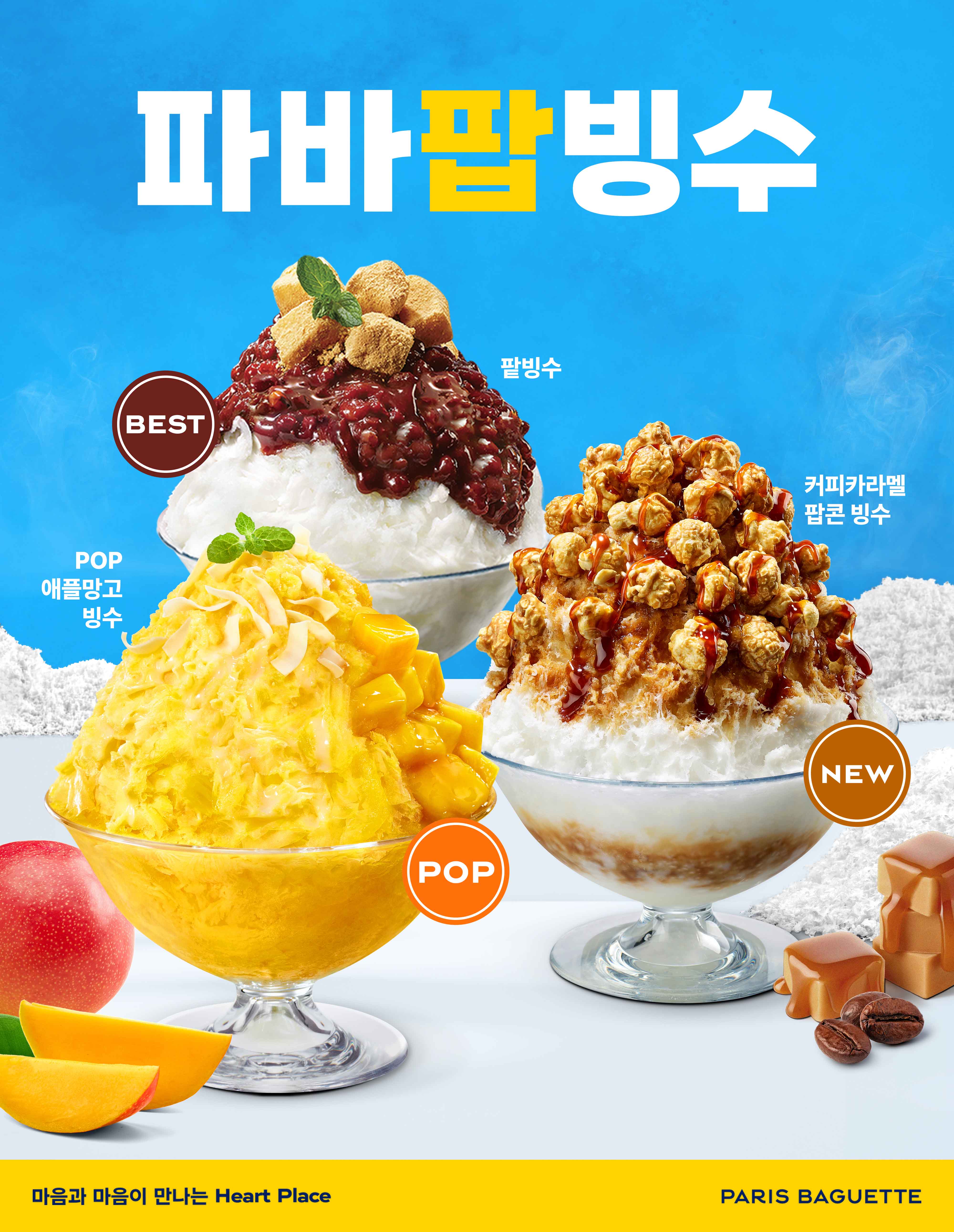 ‘파바팝빙수’의 팝(POP)은 ‘팝’콘 빙수, ‘POP(인기 있는)’ 애플망고 빙수, ‘팥’빙수 등 3종을 유쾌한 언어유희로 아우르는 의미다. 팝콘을 비롯한 과일, 팥 등 다양한 토핑을 활용해 색다른 맛과 즐거움을 느낄 수 있다.