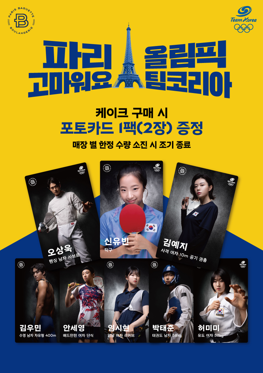 SPC그룹의 대표 브랜드 파리바게뜨가 ‘2024 파리올림픽’의 국가대표 선수단 ‘팀코리아(Team Korea)’ 포토카드를 자체 제작해 증정하는 이벤트를 진행한다고 14일 밝혔다.