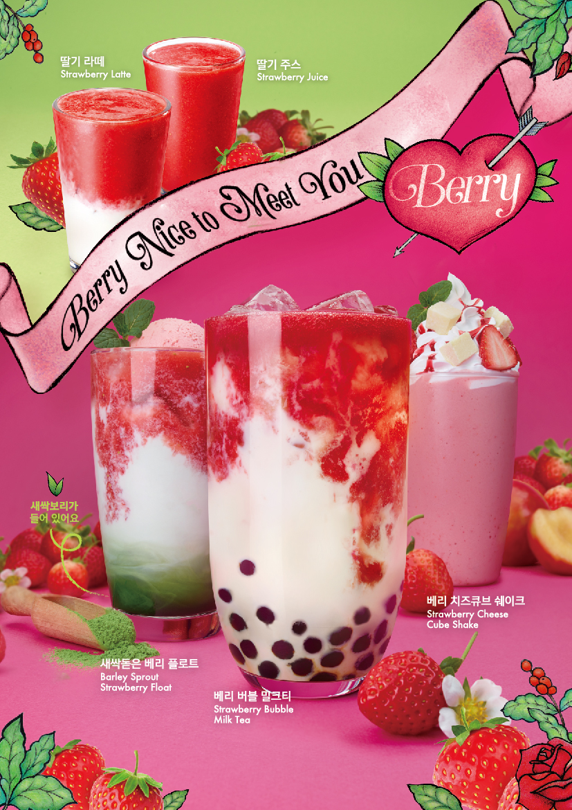 이번에 선보인 딸기 음료는 총 7종으로 △ 고소한 새싹보리가 들어간 라떼에 딸기 젤라또가 올라간 ‘새싹돋은 베리 플로트(R6,700원/L7,200원)’ △ 버블 밀크티에 딸기를 더해 상큼하고 달콤한 맛이 특징인 ‘베리 버블 밀크티(L6,900)’ △ 딸기 쉐이크 위에 큐브 치즈 케이크를 올린 ‘베리 치즈큐브 쉐이크(R6,900원/L7,400원) △ 신선한 우유와 딸기를 조화시킨 ‘딸기 라떼(R6,500원/L7,000원)’ △ 제철 딸기의 진한 맛을 느낄 수 있는 ‘딸기 주스(R6,500원/L7,000원)’ △ 생딸기를 갈아 넣어 식감을 살린 RTD 제품 2종 ‘찹찹 딸기라떼’와 ‘찹찹 새싹보리 딸기라떼’ (2종 모두 500ml 7,300원 / 300ml 6,300원)도 함께 출시했다. 딸기 음료와 환상의 궁합을 자랑하는 디저트도 출시한다. 갓 구운 허니브레드 위에 새콤한 딸기와 달콤한 생크림을 올린 ‘스트로베리 허니브레드’(6,500원)와 콰트로 치즈 타르트에 생딸기를 빼곡히 올린 ‘스트로베리 치즈 타르트’(2,600원)등이다.