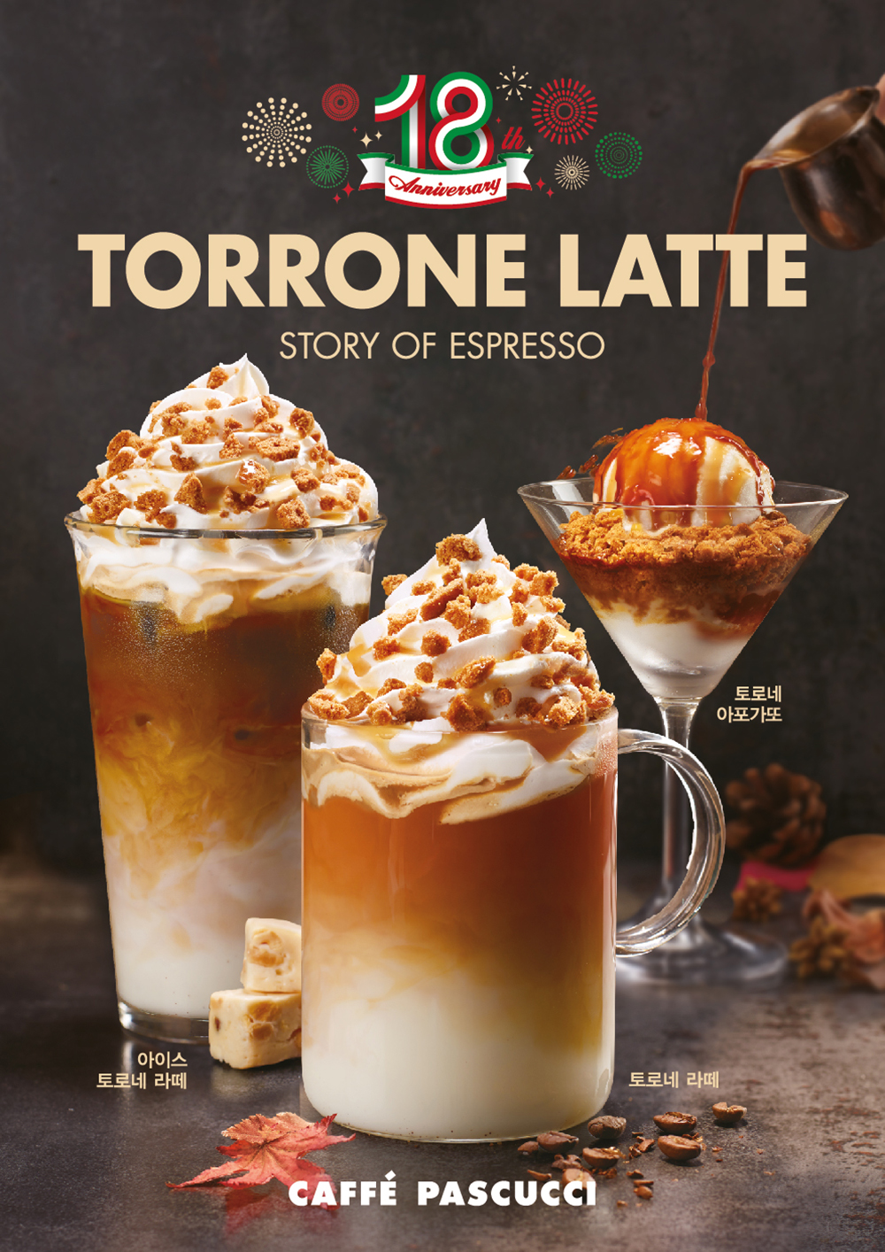 파스쿠찌는 매년 브랜드 론칭 기념일에 맞춰 이탈리아 에스프레소의 정체성을 담은 S.O.E(Story of Espresso) 메뉴를 출시하고 있다. 2017년의 ‘피오르디’, 2018년의 ‘버터스카치’, 2019년 ‘골든색 에스프레소’를 활용한 메뉴를 출시한 바 있다. 이번 18주년 기념 메뉴는 이탈리아의 전통 디저트인 ‘토로네(Torrone)’를 활용했다.