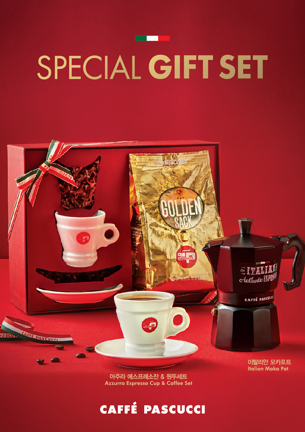 파스쿠찌는‘홈 카페’ 트렌드에 맞춰 홈 브루잉 용품부터 텀블러와 티트라(Teatra) 티백, 드립 커피 백, 모카포트 등으로 구성한 선물세트를 출시했다. 또, 커피와 함께 즐기기에 안성맞춤인 케익 1종도 선보인다.