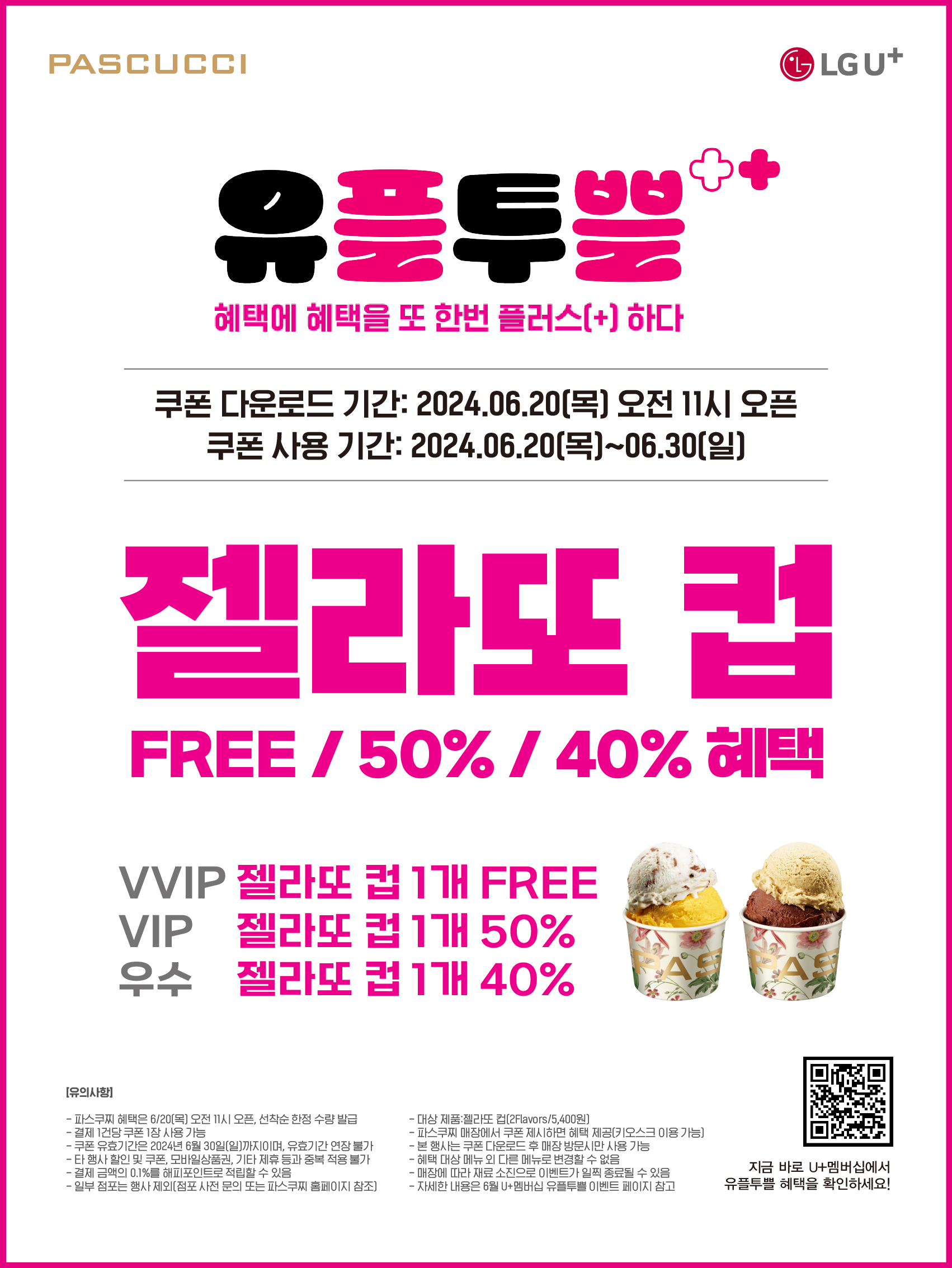 파스쿠찌는 통신사 LG유플러스와 제휴해 젤라또 컵 쿠폰을 제공하는 ‘유플투쁠’ 프로모션을 진행한다. 쿠폰은 LG유플러스 멤버십 앱 내 유플투쁠 페이지에서 받을 수 있으며, 오는 20일 오전 11시부터 선착순 한정 수량으로 제공한다. 쿠폰 사용 시 회원 등급에 따라 VVIP 회원은 무료, VIP 회원은 50%, 우수 회원은 40% 혜택이 적용된 가격으로 젤라또 컵을 즐길 수 있다. (일부 점포 제외, 타 행사 할인 및 쿠폰 등과 중복 적용 불가)