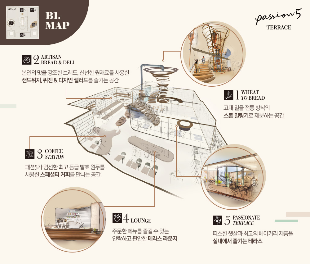 지금까지 새로운 베이커리 공간 ‘패션5 테라스’를 소개해 드렸습니다. 첨단 제분 시스템과 더불어 건강하고 독특한 재료로 만든 다양한 메뉴들이 인상적인 공간이었는데요. 여러분도 새롭게 오픈한 패션5 테라스에 방문하셔서 편안한 시간을 보내고, 특별한 베이커리 메뉴를 직접 맛보시는 건 어떨까요?