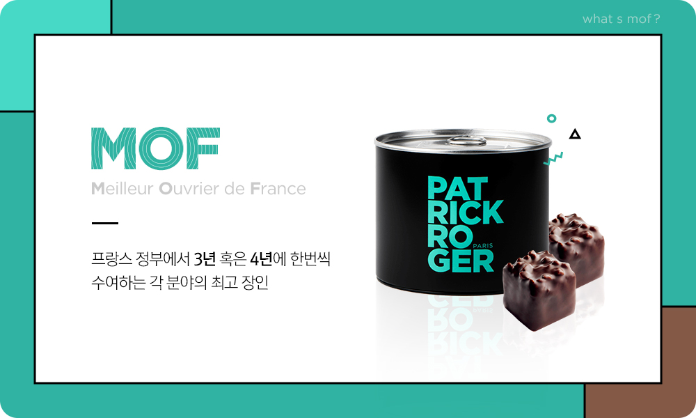 패트릭 로저의 명성은 그가 보유 중인 MOF 타이틀로도 설명이 가능한데요. ‘MOF’Meilleur ouvrier de France의 줄임말로 프랑스 각 분야의 최고 장인(長人)을 일컫는 말입니다. 이는 프랑스에서 4년에 한 번씩 열리는 국가 주관의 콩쿠르를 통해 선발되는데요. 초콜릿뿐만 아니라 제과, 제빵, 아이스크림, 육가공, 소믈리에 등 다양한 부문의 전문가들이 서류 심사부터 예선과 결선의 과정을 통해 실력을 겨루게 되며, 명실상부한 명장만이 MOF 칭호를 얻을 수 있습니다. 패트릭 로저는 2000년, 32세의 나이로 MOF 타이틀 획득했는데요. 전 세계인의 마음을 사로잡은 그의 초콜릿 이야기를 자세히 알아보겠습니다.