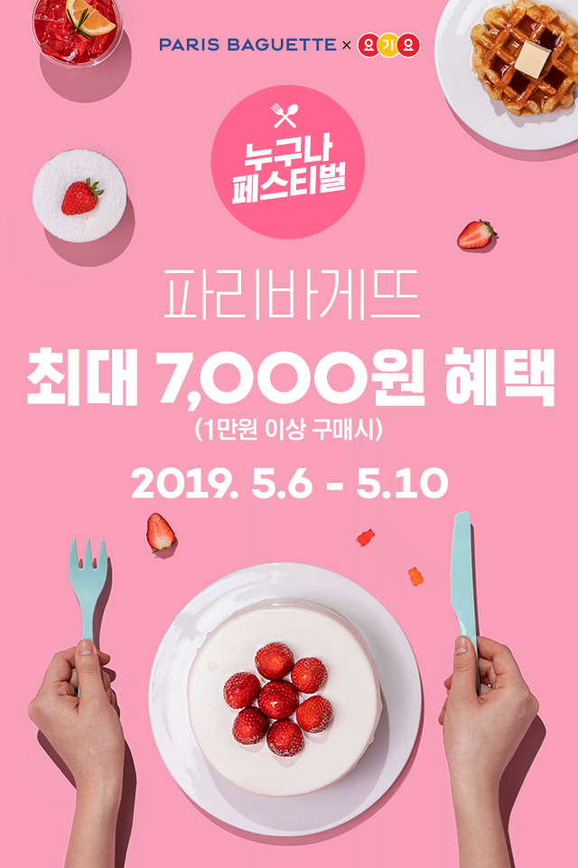 파리바게뜨에서는배달앱요기요와 함께 ‘누구나 페스티벌’ 이벤트도 진행한다. 오는 10일까지 소비자가 요기요앱을 통해 파리바게뜨 제품을 1만원 이상 주문하면 최대 7천원 혜택을 매일 제공한다. 소비자는 요기요에서 진행하는 카페 디저트 쿠폰(5천원 할인)을 다운로드받아 오전 11시부터 오후 8시까지 주문할 수 있으며, ‘슈퍼레드위크(2천원)’ 할인도 함께 제공받을 수 있다. (행사 기간 내 중복 이용 가능, 1일 1회) (끝)
