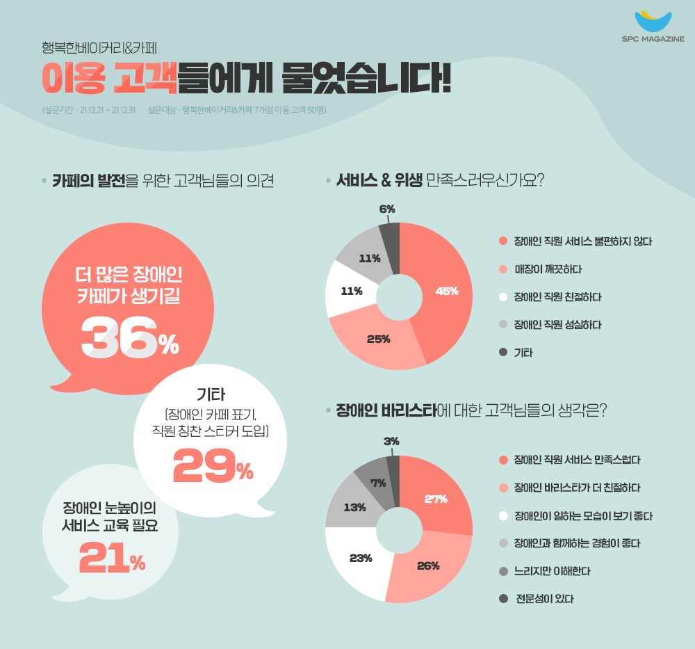 행복한 베이커리 & 카페의 발전을 위해 ㈜행복한거북이는 지난해 말 7개 매장 이용 고객들을 대상으로 설문조사를 진행했는데요. 매장 서비스와 위생에 대한 만족도를 묻는 질문에 전체 응답자 중 절반에 가까운 45%는 ‘장애인 직원이 제공하는 서비스가 불편하지 않다’고 답했습니다. ‘매장이 깨끗하다(25%)’, ‘장애인 직원이 친절하다(11%)’, ‘장애인 직원이 성실하다(11%)’ 등의 답변도 뒤를 이었는데요.
