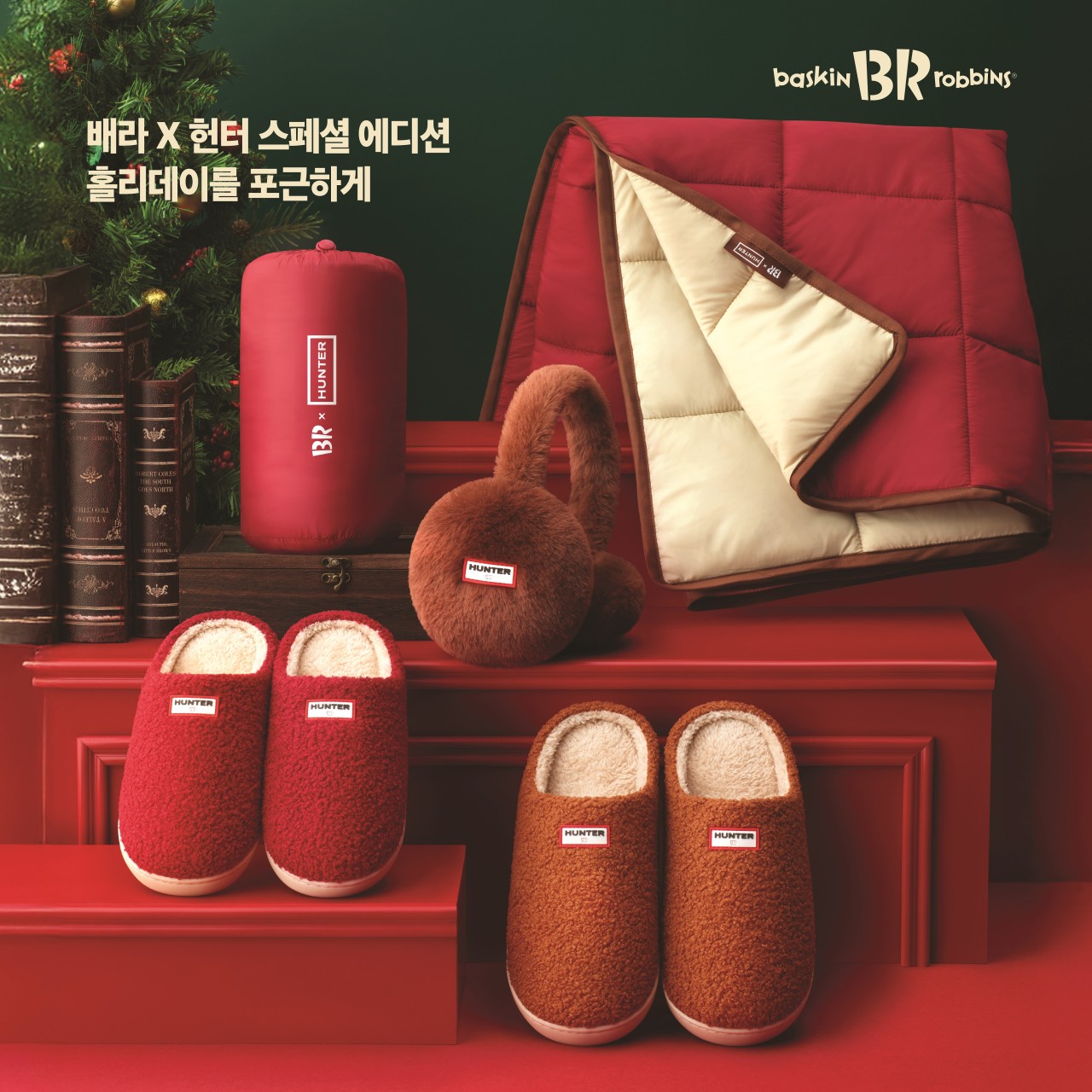배스킨라빈스는 ‘홀리데이 판타지(Holiday Fantasy)’를 테마로 글로벌 라이프스타일 브랜드 ‘헌터(HUNTER)’와 협업한 홀리데이 굿즈를 선보였다. 겨울 시즌에 어울리는 디자인과 실용성을 겸비한 이번 굿즈는 출시와 동시에 소비자들의 높은 관심을 받았다. 크리스마스 무드를 담은 ‘X-mas 하우스 슬리퍼’는 오프라인 판매 시작 3일 만에 완판됐으며, 보온성과 휴대성을 갖춘 ‘X-mas 패커블 패딩 블랭킷’과 겨울 스타일링 포인트로 활용 가능한 ‘X-mas 이어머프’ 역시 꾸준한 판매를 이어가고 있다.