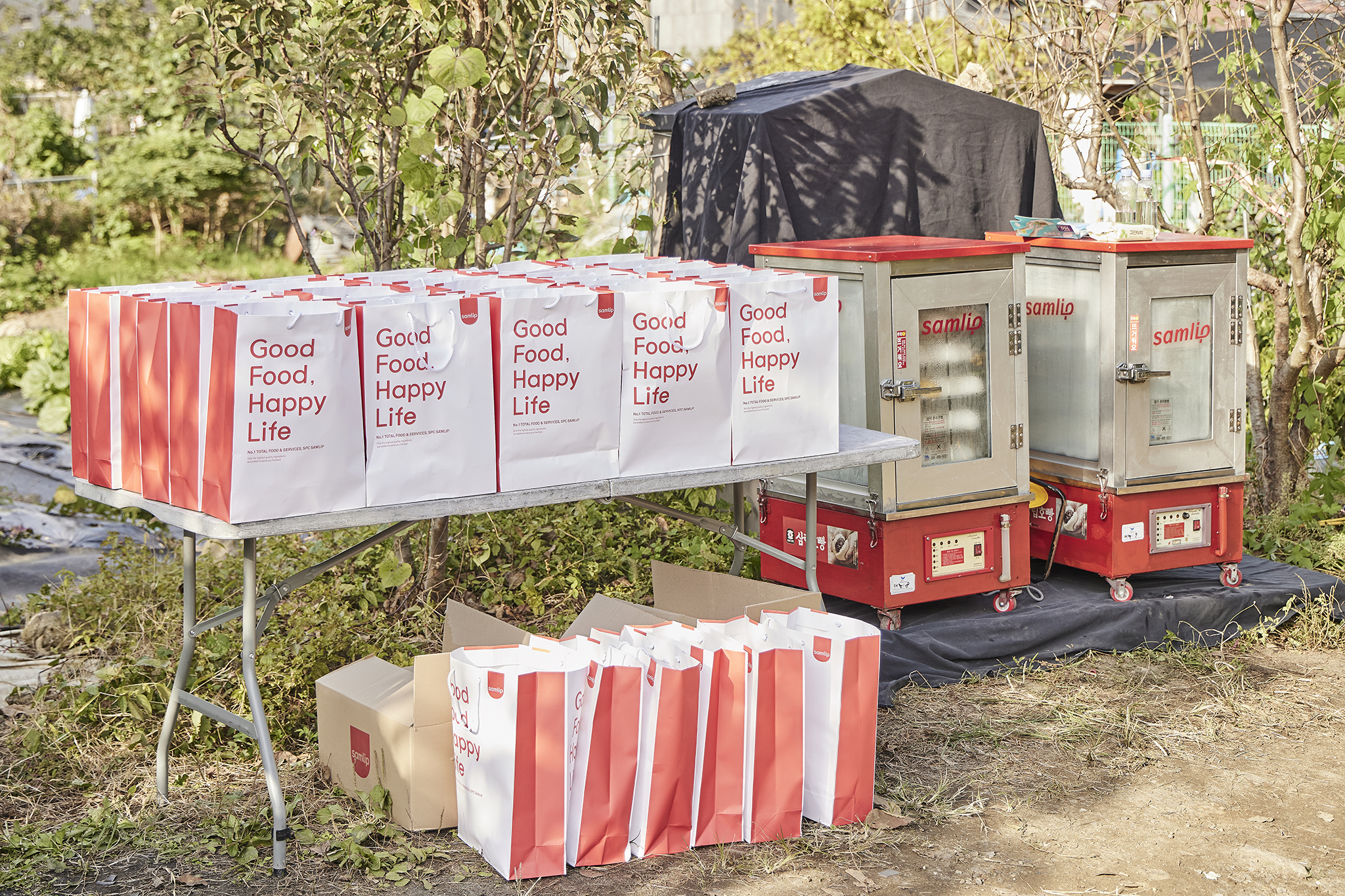 현장에 설치한 찜기에서 갓 찐 삼립호빵을 준비하는 SPC그룹 임직원