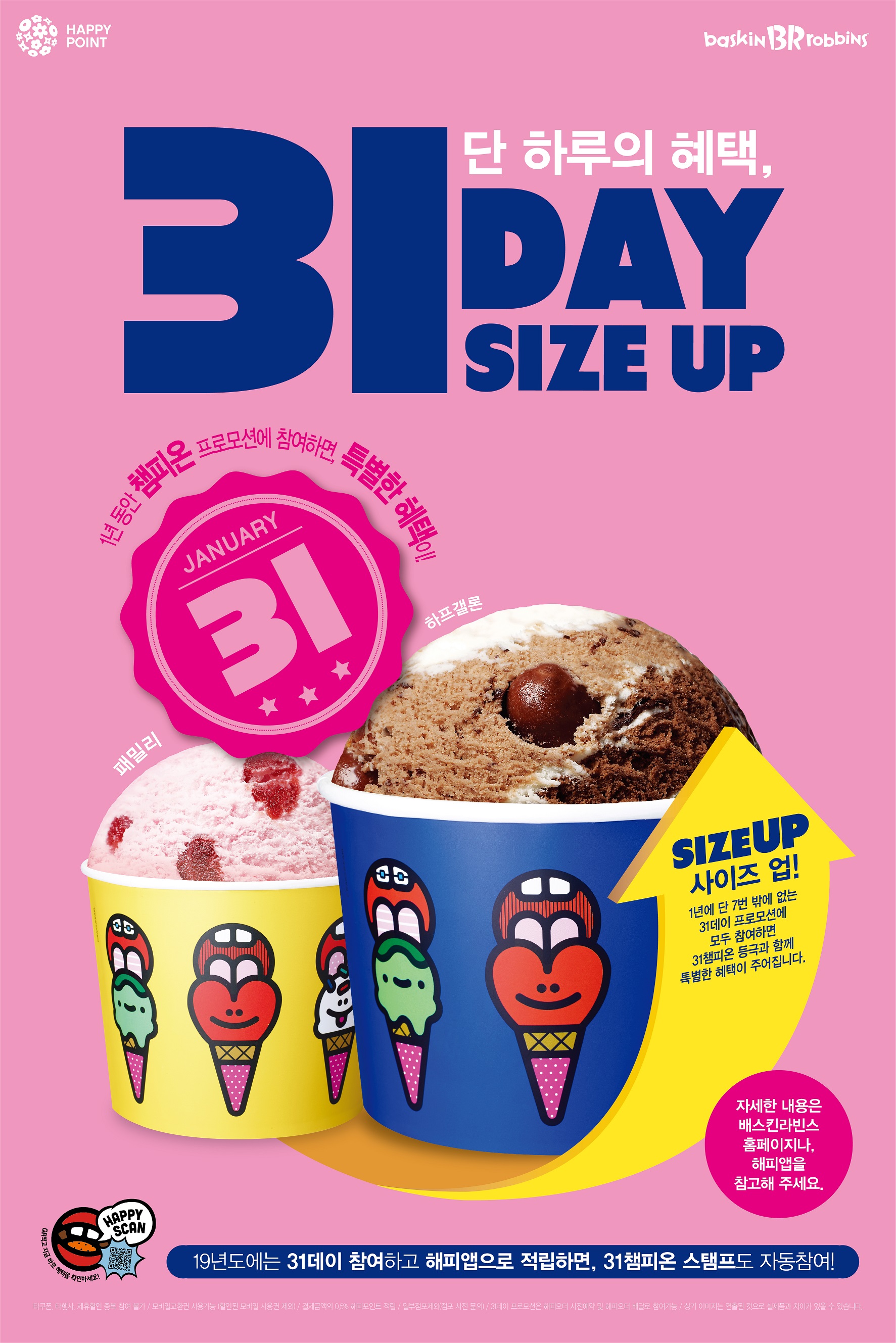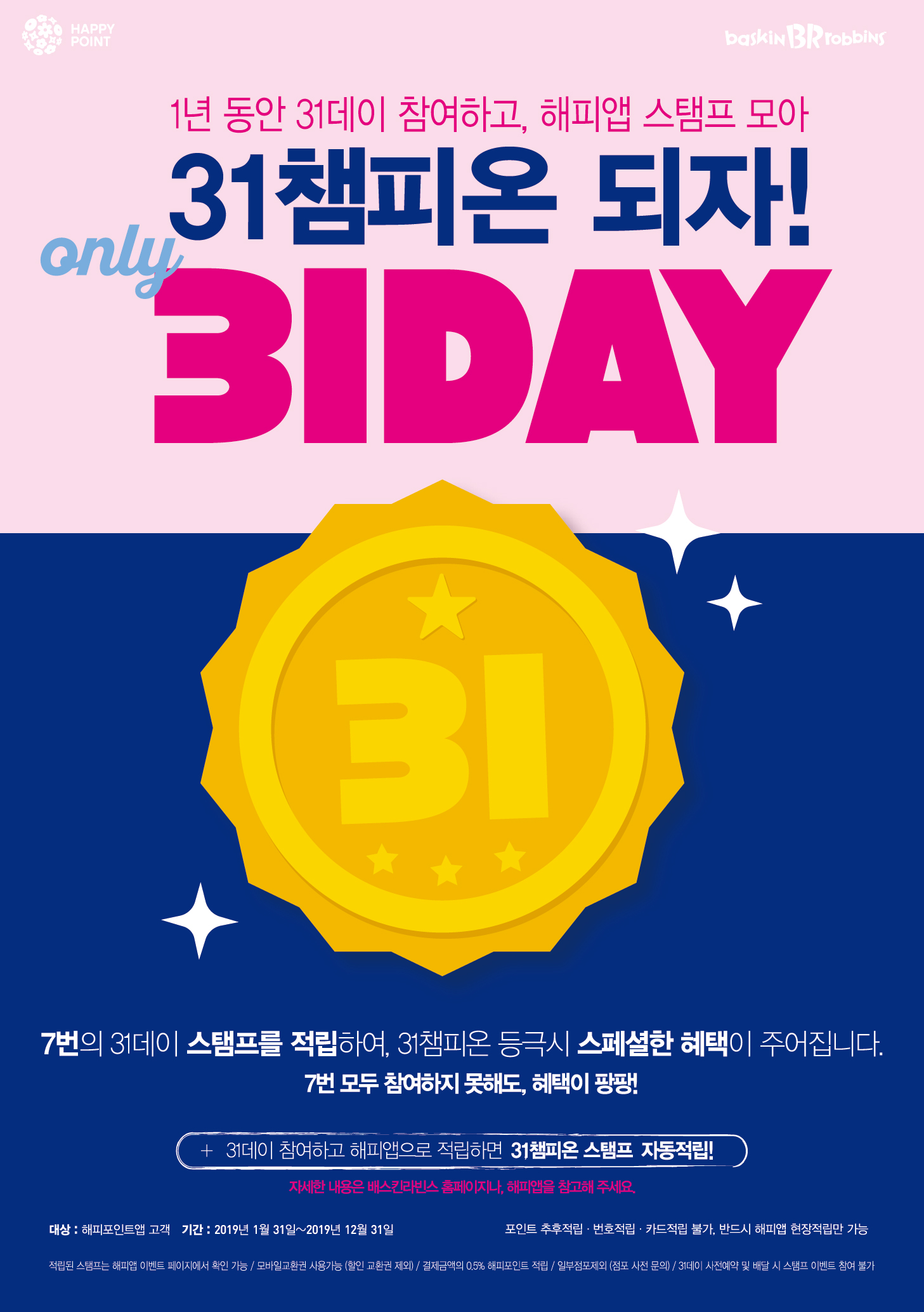 2019년 새해를 맞아 새롭게 도입하는 ’31스탬프 프로모션’도 함께 운영한다. ‘31DAY’ 프로모션에 참여한 뒤, 해피포인트 앱을 통해 포인트를 적립하면 ’31스탬프’가 자동으로 누적되는 행사다. 스탬프 개수에 따라 아이스크림 무료 교환권 등 다양한 선물을 증정한다. 올해 ’31DAY’는 1월에 이어 3월, 5월, 7월, 8월, 10월, 12월의 마지막 날에 진행되고, 총 7개의 스탬프를 모두 적립하면 ‘31챔피온’에 등극하게 된다. 이들에게는 보다 특별한 혜택이 주어질 예정이다. (일부 점포 제외, 자세한 내용은 홈페이지 참조)