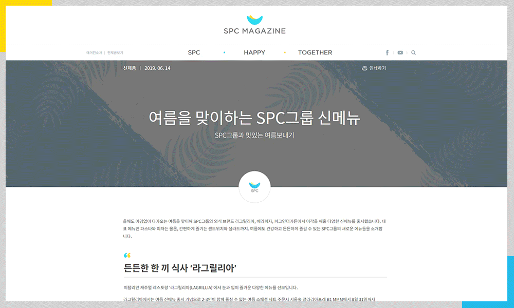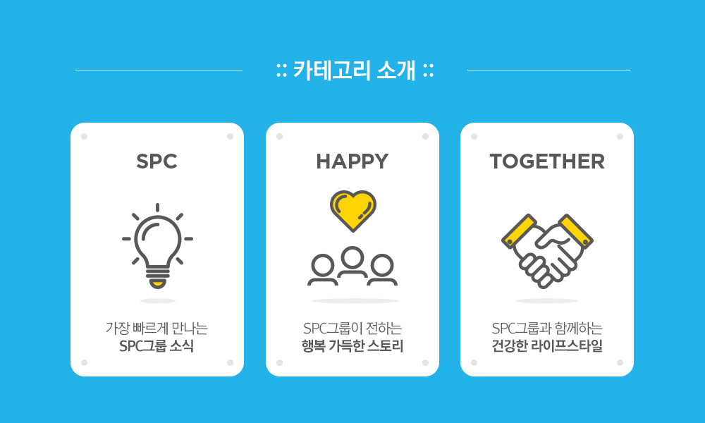 마지막으로 TOGETHER 카테고리에서는 SPC그룹과 함께하는 건강한 라이프스타일 콘텐츠들을 보실 수 있습니다. 행복한 일상을 위한 행복연구소에서는 SPC컬리너리아카데미의 전문 강사진이 알려주는 특별한 레시피, 해피라이프에서는 식음료 전문 필진이 SPC그룹의 이야기를 글과 그림으로 담아낸 소식을 확인하실 수 있으며, 매월 발행되는 뉴스레터와 이벤트 소식 등도 보실 수 있습니다.
