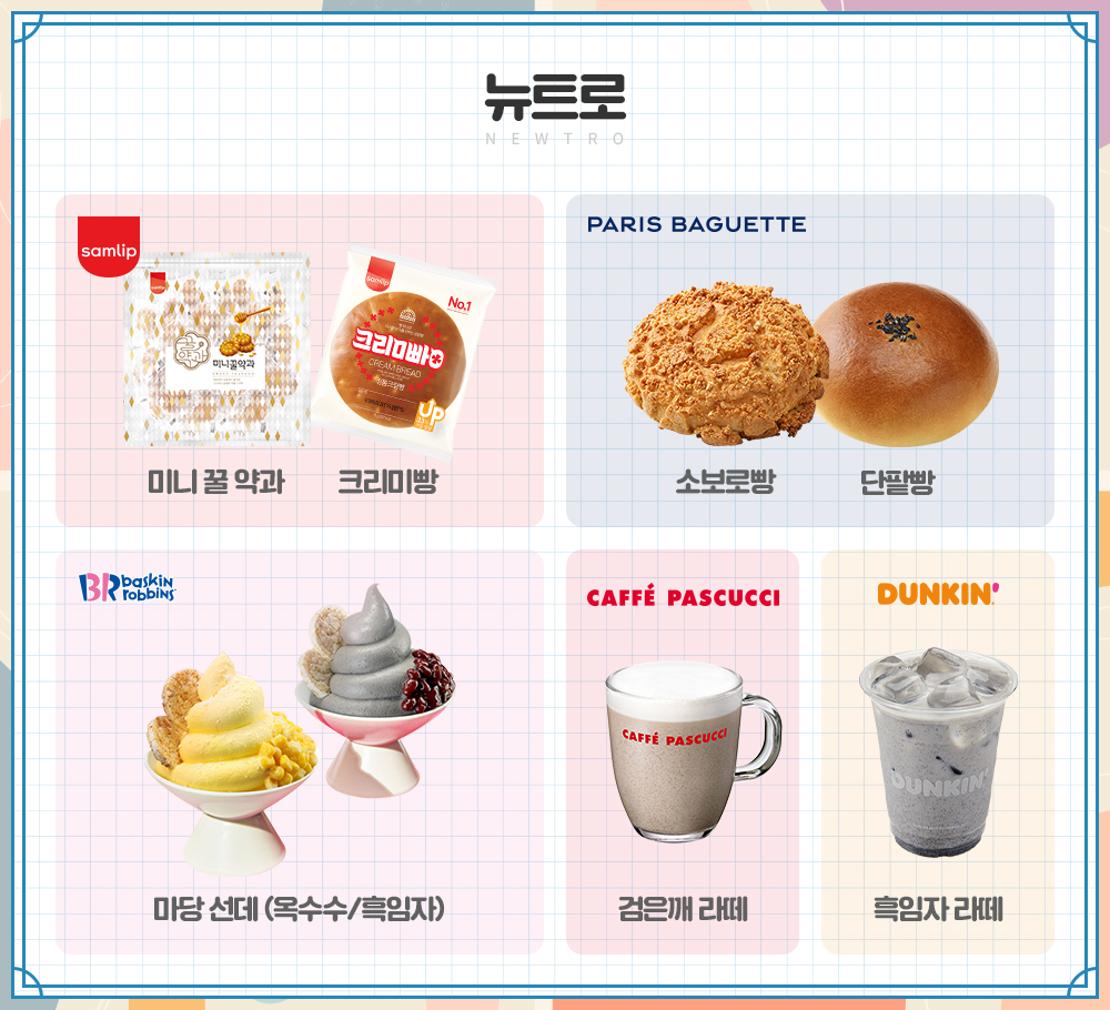 최근 유행하는 ‘할매 입맛’이라는 말을 들어보셨나요? MZ세대가 흑임자나 인절미, 미숫가루 등 다소 예스러운 간식에 열광하게 되면서 생긴 신조어인데요. 이러한 트렌드에 발맞추어 예스러운 맛을 가미한 다양한 디저트들이 출시되며 ‘뉴트로(Newtro)’ 열풍이 불고 있습니다. ‘뉴트로’는 새로움(New)과 복고(Retro)의 합성어로 복고 요소를 찾아내 현대적인 감각에 맞게 재해석한 스타일을 의미합니다. 소위 ‘아재 입맛’이라고 불리는 삼립의 ‘미니 꿀 약과’나 ‘크리미빵’, 파리바게뜨의 ‘소보로빵’과 ‘단팥빵’ 등이 밀레니얼 세대와 Z세대에게 사랑받는 것도 복고풍의 감성을 자극했기 때문입니다.