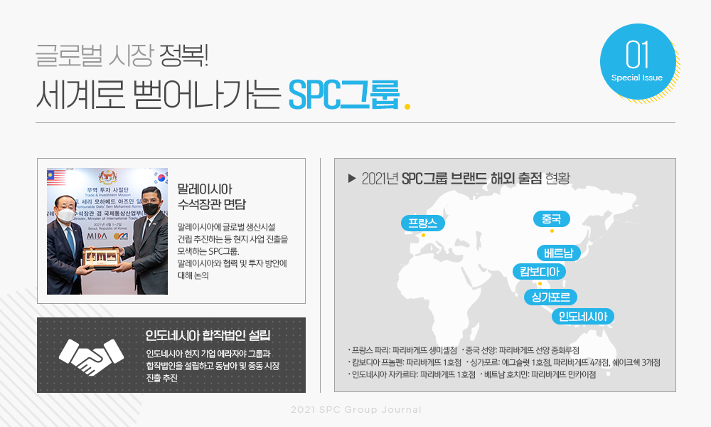 길었던 2021년도 어느덧 끝을 향해 달려가고 있습니다. 올 한 해 무탈히 잘 보내셨는지요. SPC그룹은 지난 1년간 코로나19로 어려움을 겪는 이웃들의 웃음을 되찾아 드리고자 최선을 다했는데요. 전 세계가 코로나 팬데믹에 휩싸인 가운데서도 활발히 해외 진출을 추진하는 등 눈에 띄는 성과도 거뒀습니다. 오늘은 2021년 한 해를 빛낸 SPC그룹의 주요 이슈들을 되돌아보는 시간을 가져볼까 합니다. 아래 이미지의 각 제목을 클릭해 SPC그룹의 2021 주요 소식을 자세히 살펴보세요!