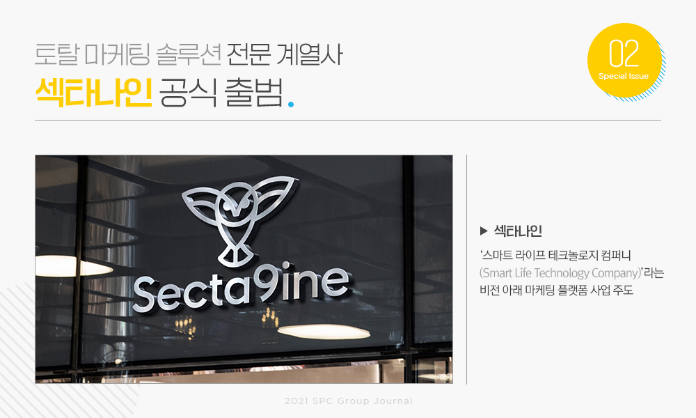 고객에게 더 나은 서비스와 편리한 라이프스타일을 제공하고자, SPC그룹은 올해 초 토탈 마케팅 솔루션 전문 계열사 섹타나인(Secta9ine)을 공식 출범했습니다. 섹타나인은 SPC그룹이 그간 축적해 온 플랫폼 비즈니스 기술력과 마케팅 역량, ICT(정보통신기술) 사업 인프라를 결집해 만든 디지털 마케팅 전문기업인데요. ‘스마트 라이프 테크놀로지 컴퍼니(Smart Life Technology Company)’라는 비전 아래, 그룹 전반의 디지털 플랫폼 사업을 주도하고 있습니다. 올해에만 온라인 간편결제 서비스인 해피페이를 시작으로, 내비게이션 앱에서 간편하게 픽업 주문이 가능한 TMAP 픽업, 장보기와 SPC그룹 제품 주문을 한 번에 해결해주는 해피버틀러 서비스 등을 선보였는데요. 섹타나인은 다양한 디지털 서비스를 지속해서 선보이며 고객에게 더욱 편리하고 새로운 경험을 선사할 계획입니다.