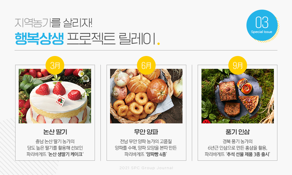 코로나19의 여파가 장기화되면서 우리 농가는 지역 축제 취소로 인해 판로 확보에 어려움을 겪는 등 막대한 피해를 입었습니다. 이에 SPC그룹은 지난해에 이어 올해에도 지역 농산물을 수매해 신제품을 선보이는 행복상생 프로젝트를 진행하며 농가 돕기에 나섰는데요. 먼저, 3월에는 논산 딸기를 활용해 파리바게뜨, 피그인더가든 등에서 신제품을 선보였습니다. 6월엔 무안 양파로 만든 파리바게뜨 양파빵 4종을 출시했는데요. 소외계층 및 코로나19 방역 봉사자들에게 양파빵 10만여 개를 전달하기도 했습니다. 9월에는 추석을 앞두고 풍기 인삼으로 만든 파리바게뜨 추석선물제품을 내놨는데요. 파리바게뜨는 올 10월, 창립 35주년을 맞아 행복상생 제품을 코로나19 의료진과 독거노인들에게 기부했습니다. 지역 농가의 판로 확대와 우리 농산물 소비 활성화를 위한 행복상생 프로젝트는 내년에도 쭉 이어질 예정인데요. SPC그룹의 맛있는 상생 행보에 많은 관심과 응원 부탁드립니다.