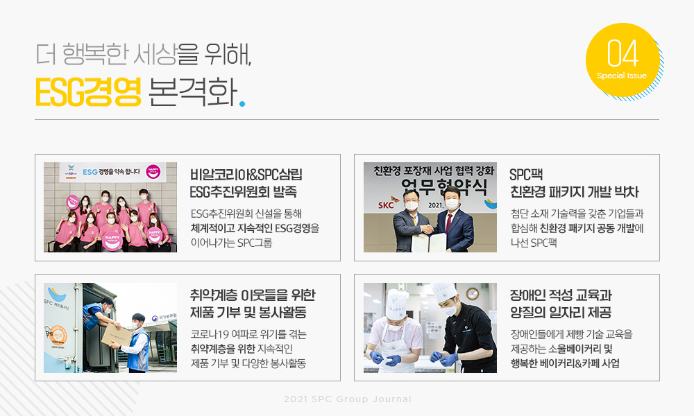 환경(Environment)과 사회(Social), 기업 지배구조(Governance) 전반에 걸쳐 지속가능한 발전을 도모하는 ESG경영은 SPC그룹이 추구하는 가치와 맞닿아 있는데요. 올해 SPC그룹의 각 계열사는 ESG 전담 조직을 신설하며 본격적인 ESG경영에 돌입했습니다. SPC삼립은 이사회 산하에 ESG위원회를 구성하고 환경, 건강, 사회, 신뢰 등 4대 항목에 중점을 둔 ‘모두를 위한 약속(Good For All)’ 추진 방안을 밝혔습니다. 비알코리아는 ESG추진단을 꾸려 ‘Happy With Us, 비알코리아’라는 슬로건 아래 환경, 사회, 지배구조, 고객 등 4개 분야에서 세부 과제를 추진합니다.