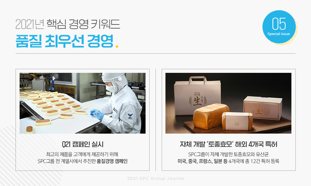 SPC그룹은 2021년 핵심 경영 키워드를 ‘품질 최우선 경영’, ‘책임 경영’, ‘변화와 혁신’으로 선정하고 이를 실천하기 위해 바쁜 한 해를 보냈는데요. 그중에서도 품질 최우선 경영은 회사 경쟁력의 원천인 맛과 품질을 최고 수준으로 구현하고자, SPC그룹 전 조직이 Q21 캠페인을 펼치며 적극적으로 추진해 온 과제입니다, 파리바게뜨, 파스쿠찌 등을 운영하는 ㈜파리크라상은 원자재 검증, 부적합품 입고 차단, 공정 준수, 법규위반율 등을 성과지표로 설정하여 철저한 품질 관리에 나섰는데요. 유관부서 합동 관능평가를 실시하는 등의 품질 개선 활동도 활발히 진행했습니다.