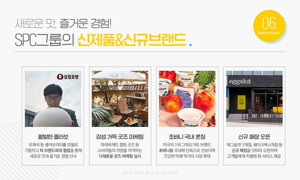 올해에도 SPC그룹은 다양한 신제품과 신규브랜드를 선보이며 고객들에게 다채로운 행복을 선사했는데요. 파리바게뜨와 SPC삼립은 배구황제 김연경을 모델로 선정해 각각 ‘토종효모식빵’을 홍보하고 신제품 식빵언니를 출시했습니다. 삼립호빵은 모델로 유재석을 기용하고 로제호빵, 민트초코호빵 등을 선보여 뜨거운 호응을 얻고 있지요. 고객들의 취향을 저격하는 다양한 굿즈 마케팅도 연신 화제를 모았는데요. 아웃도어 브랜드 노르디스크와 협업해 4차례에 걸쳐 캠핑 굿즈를 출시한 파리바게뜨, 라이프스타일 브랜드 위글위글과 손잡고 피크닉 매트와 투명 장우산 굿즈를 내놓은 배스킨라빈스 등 여러 브랜드에서 매력적인 굿즈들을 선보였습니다.