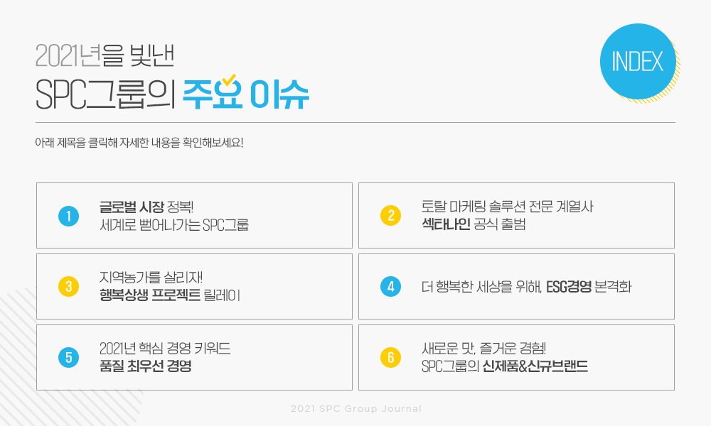 길었던 2021년도 어느덧 끝을 향해 달려가고 있습니다. 올 한 해 무탈히 잘 보내셨는지요. SPC그룹은 지난 1년간 코로나19로 어려움을 겪는 이웃들의 웃음을 되찾아 드리고자 최선을 다했는데요. 전 세계가 코로나 팬데믹에 휩싸인 가운데서도 활발히 해외 진출을 추진하는 등 눈에 띄는 성과도 거뒀습니다. 오늘은 2021년 한 해를 빛낸 SPC그룹의 주요 이슈들을 되돌아보는 시간을 가져볼까 합니다. 아래 이미지의 각 제목을 클릭해 SPC그룹의 2021 주요 소식을 자세히 살펴보세요!