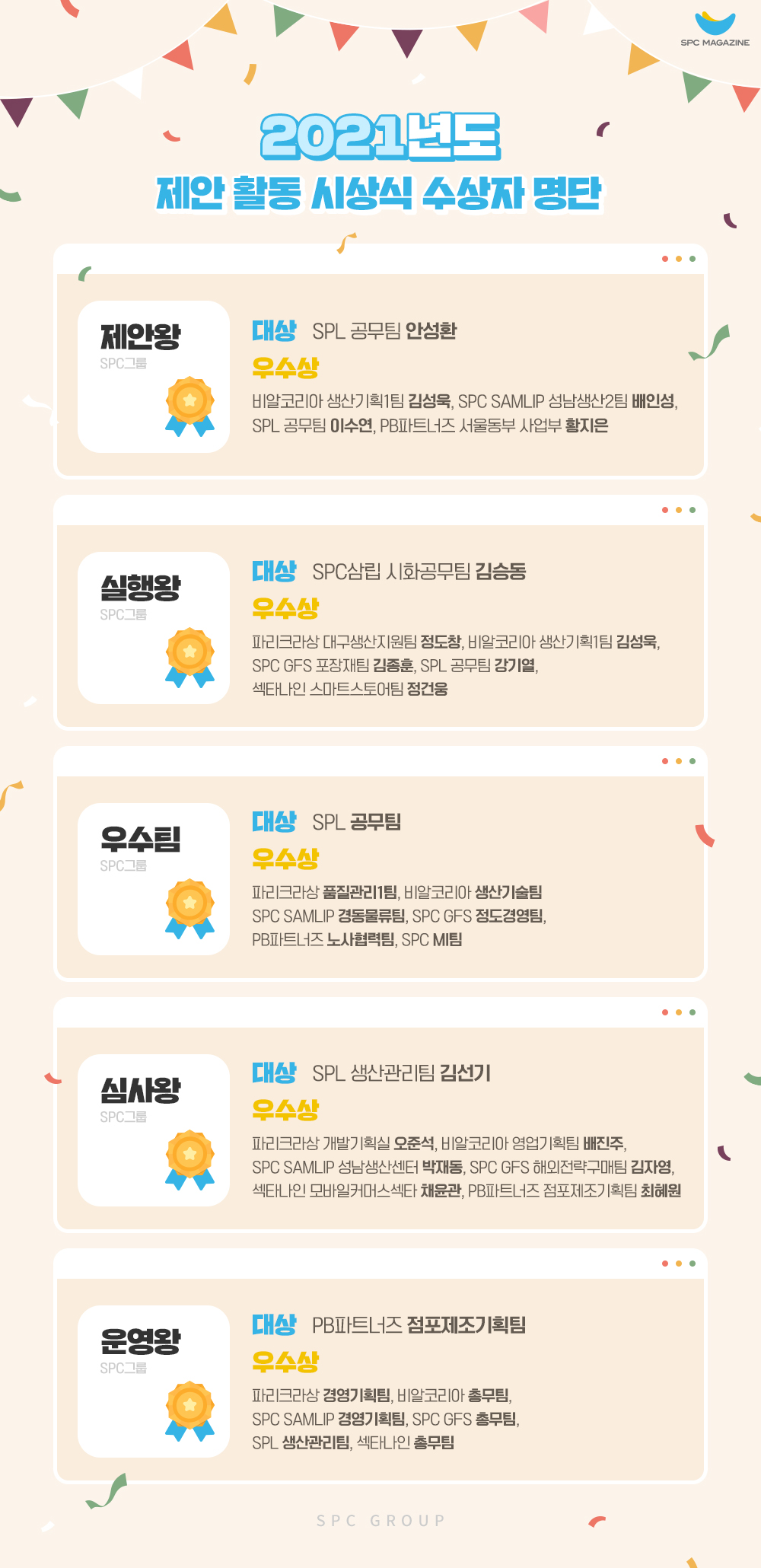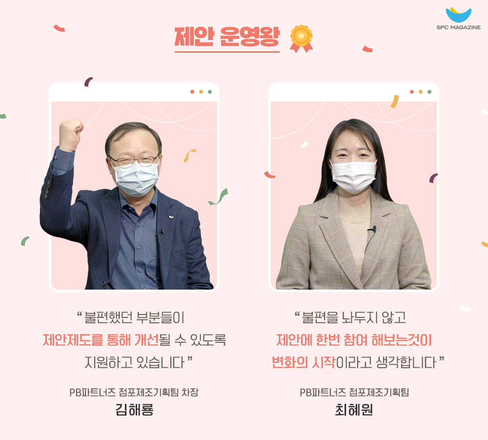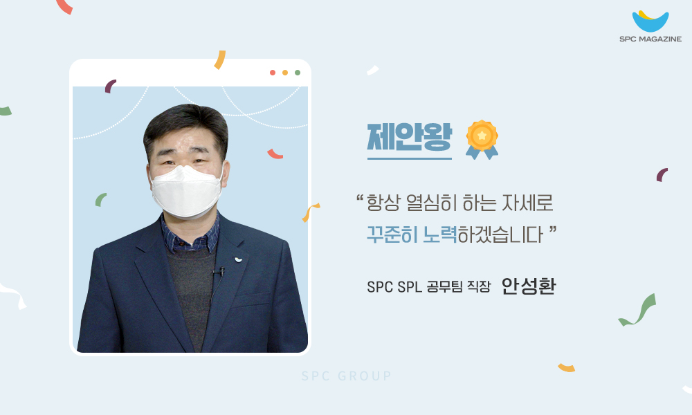 SPC그룹은 임직원들의 새로운 아이디어를 적극적으로 수렴하는 ‘제안 제도’를 통해 제품, 서비스, 업무, 품질, 사내 문화 등 다양한 분야에서 혁신을 이루고 있는데요. 특히 지난해에는 전년보다 많은 임직원들이 제안 활동에 참여해, 자사의 성장에 크나큰 보탬이 되었습니다. SPC그룹은 이달 14일 ‘2021년 제안왕 시상식’을 개최하고 우수 제안 활동 참여자들을 선정해 포상했는데요. 오늘은 지난 1년간의 제안 활동 성과를 되짚어보고, 우수 제안 참여자로 선정된 영광의 주인공들을 만나볼까 합니다.
