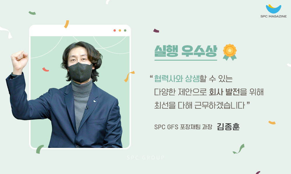 안녕하세요. 제안 실행 우수상을 수상한 SPC GFS 포장재팀 김종훈 과장입니다. 저보다는 현장에 계신 분들이 상을 받아야 한다는 생각이 들어서, 과분하게 느껴집니다. SPC 구매 담당자로서 시스템 안에서 협력사와 상생할 수 있는 사양 최적화 방법을 고민하다 보니, 제안에 활발히 참여하게 됐는데요. 이렇게 상까지 주셔서 정말 감사드립니다. 앞으로도 제가 있는 곳에서 회사 발전을 위해 최선을 다해 근무하겠습니다.