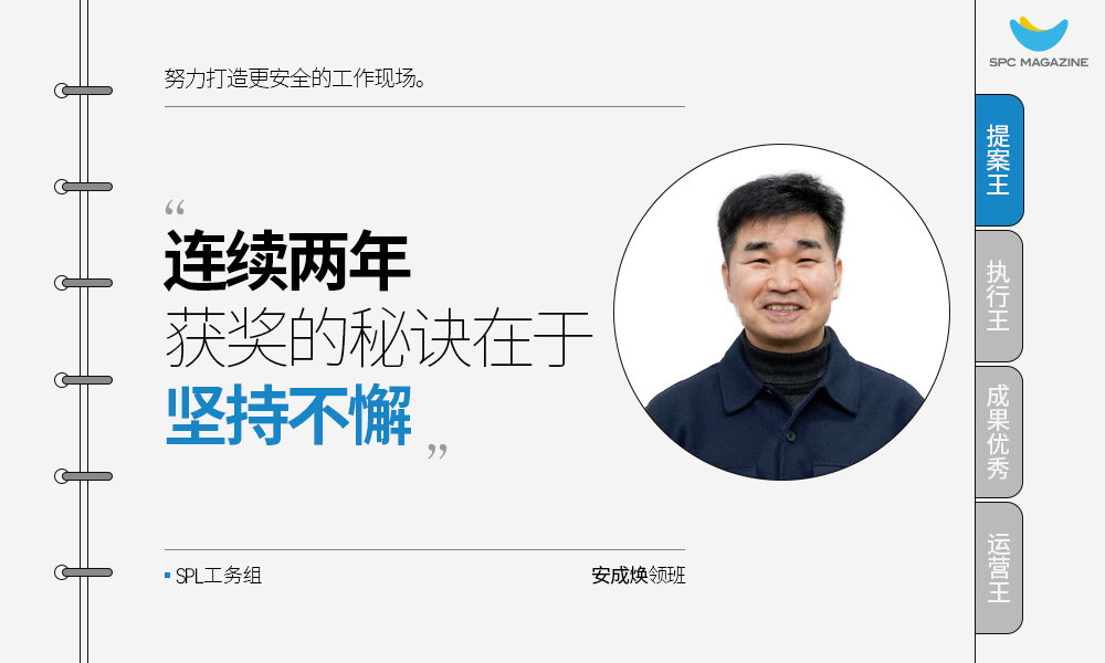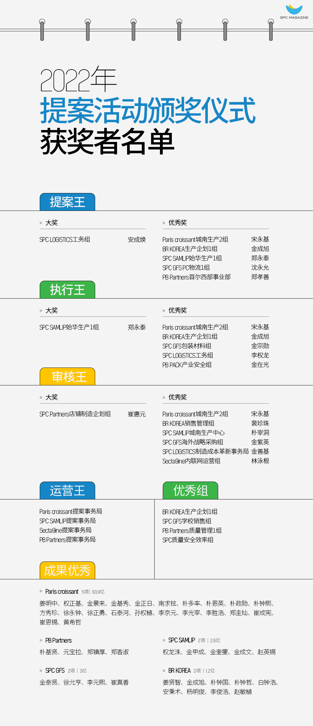 以上介绍了2022年提案王颁奖典礼的主人公们。为了推动公司的发展,率先提出想法并付诸实践,在过去一年里,他们的努力让公司大放异彩。今后,从现场劳动者到管理层,希望大家积极参与,共创SPC值得期待的光明未来。