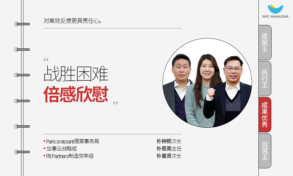 Paris croissant提案事务局朴钟熙次长和SS事业战略组朴恩英主任,以及PB Partners制造效率组朴基贤次长代表17名共同获奖者获得了成果优秀奖。他们利用钢丝筛网提高了店铺生产效率,创造经济效益约58亿元;PB Partners提案事务局金海龙部长和崔惠元主任作为PB Partners, Secta9ine. Paris croissant,SPC三立提案事务局的代表,获得了运营王奖项。特别是PB Partners和Secta9ine的年度参与率达到100%,连续两年登上运营王的宝座。下面一起来倾听闪耀2022年的提案王主人公们的感想吧。