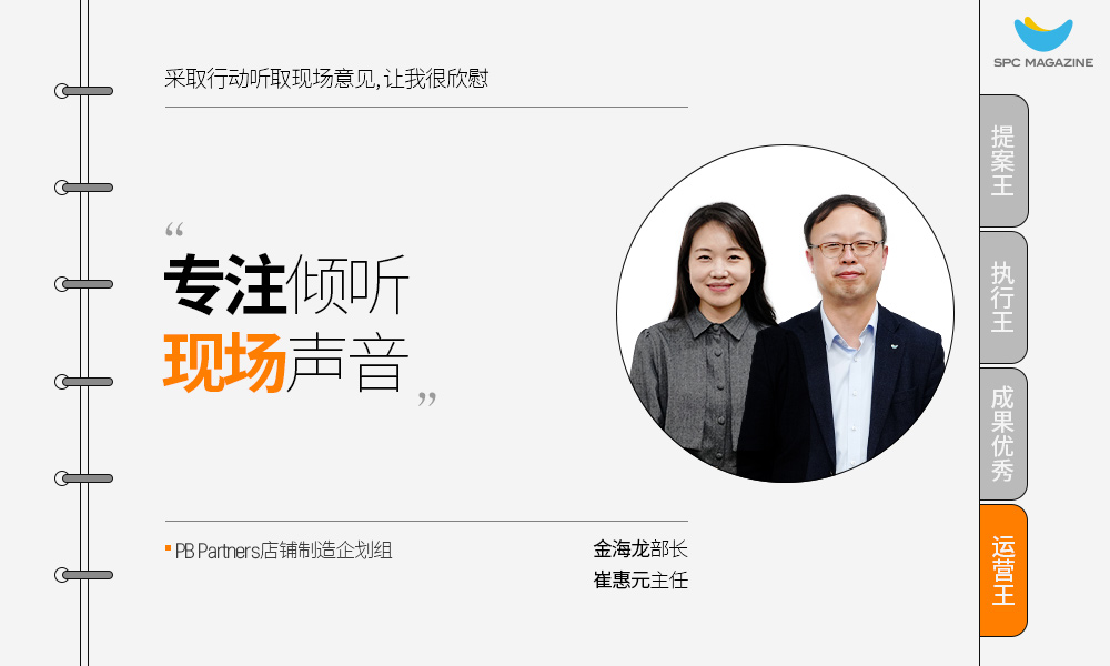 大家好。我们是获得2022年运营王的PB Partners店铺制造企划组的金海龙,崔惠元。为了鼓励员工积极参与提案制度,我们致力于提案制度的宣传,在生产现场进行推广等。我们不仅负责运营和审核提案,也对现场工作人员的意见产生共鸣,深有感触,希望能将提案有效地传达给决策者。