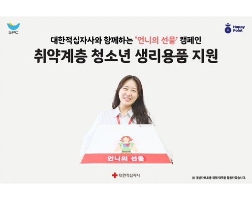 SPC그룹, 보도자료2023. 10. 1911월 15일까지 대한적십자사와 함께 ‘언니의 선물’ 캠페인 진행 SPC, 청소년 생리용품 지원하는 ‘언니의 선물’ 캠페인 진행 see more..