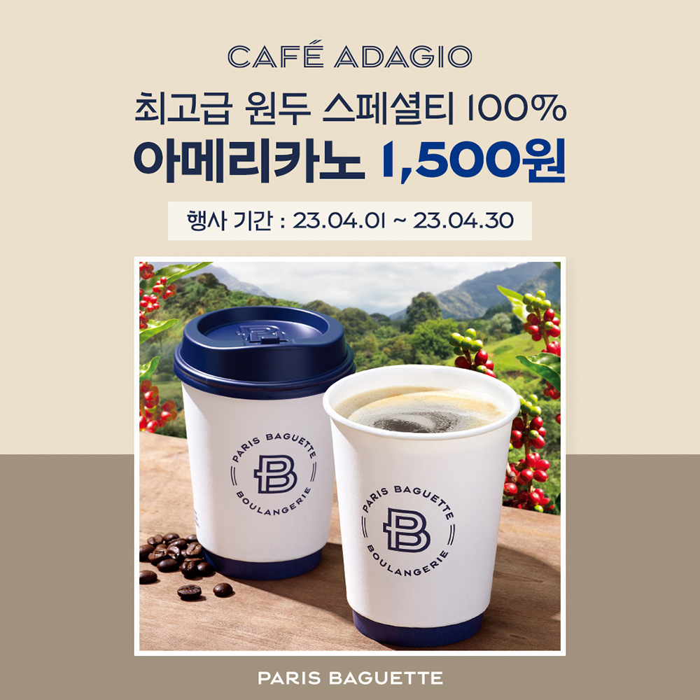 또한, 파리바게뜨는 100% 스페셜티 원두를 사용한 고소한 풍미의 ‘카페 아다지오 시그니처’의 아메리카노(HOT/권장가 2,900원, ICE/권장가 3,200원) 메뉴를 혜택가 1,500원으로 제공한다.