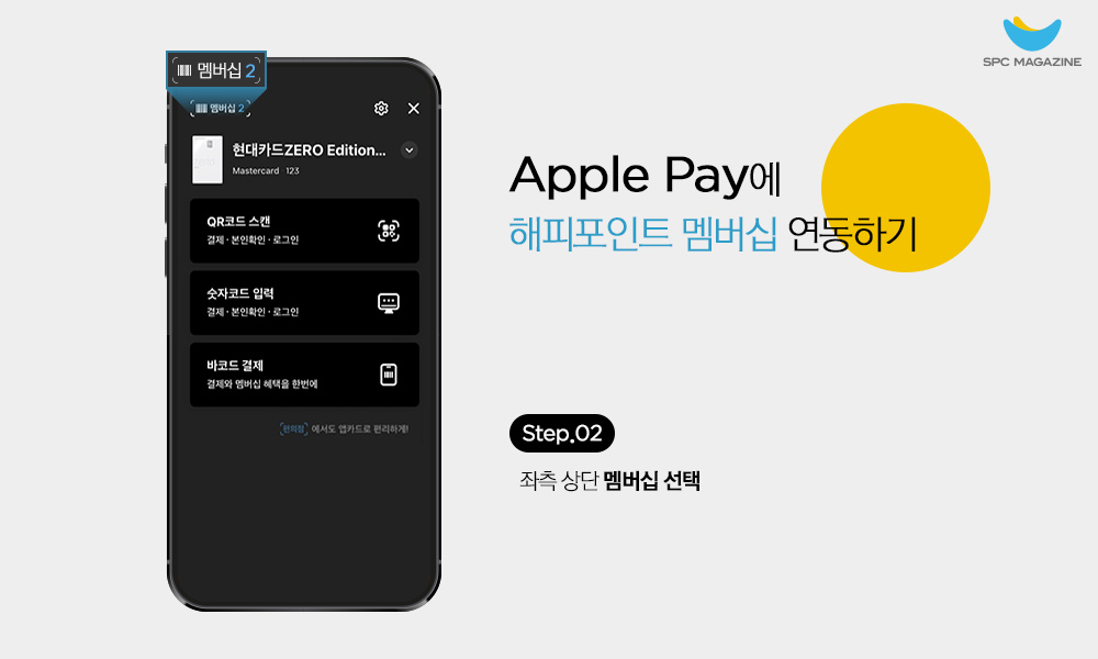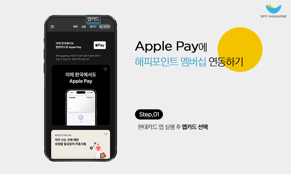 뿐만 아니라, 매장에서 Apple Pay를 사용하면 해피포인트 자동 적립도 가능합니다. 현대카드 앱을 업데이트한 후, 해피포인트 멤버십과 연동만 하면 결제 시 해피포인트가 자동으로 적립되는 방식인데요. 해피포인트는 제휴브랜드 기준에 따라 구매금액의 최대 5%까지 적립할 수 있으며, 적립된 금액은 천 원 이상부터 사용이 가능해 언제 어디서나 편리하게 혜택을 누릴 수 있습니다. 간편결제 서비스를 오랫동안 기다려온 애플 유저라면, 이제는 전국 SPC 계열 브랜드 매장에서 맛있는 먹거리를 Apple Pay로 간편하게 즐기시길 바랍니다.