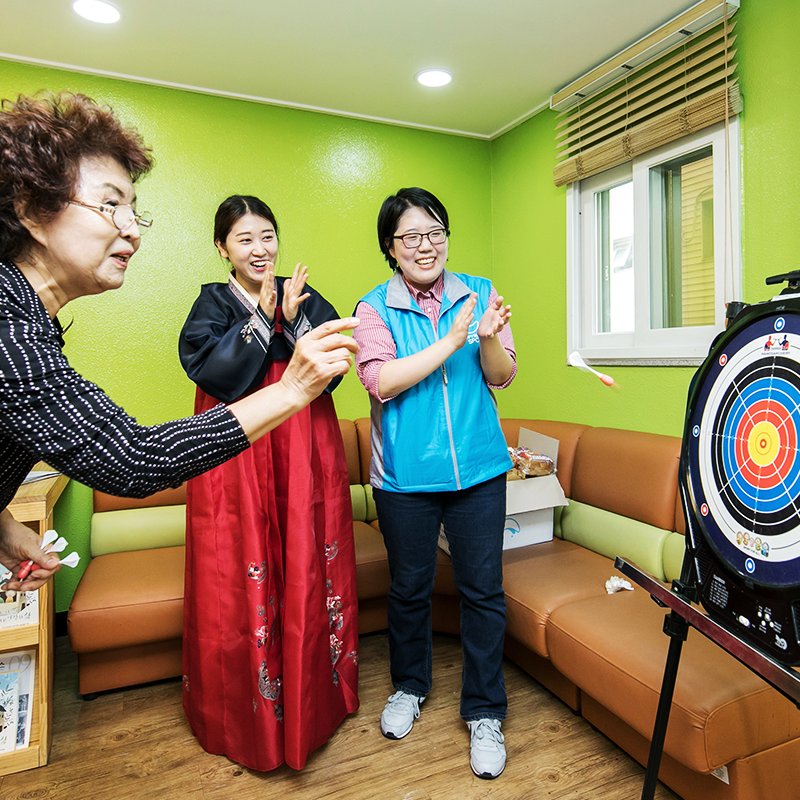 한궁 던지기, 떡메치기, 전통 무용 공연 관람 등 명절에 어울리는 민속문화 체험 시간도 마련됐습니다. 어르신들은 우리 회사 임직원들과 함께 준비된 프로그램을 즐기며 어릴 적 추억 이야기를 들려주시기도 했습니다.