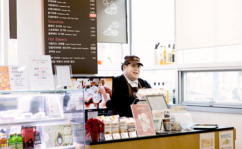 커피를 만드는 사람도, 마시는 사람도 행복해지는 카페가 있습니다. 바로, ‘SPC 행복한 베이커리 & 카페’입니다. 이 카페는 장애인 직원들을 고용해 운영하고 있는데요. 장애인 일자리를 창출하기 위해 제과제빵 전문기업인 SPC그룹과 서울시, 푸르메재단, 장애인 복지시설 ‘애덕의 집 소울베이커리’ 등이 함께 역량을 모아 운영하는 카페입니다. 현재 총 7곳의 지점에서 20여 명의 장애인 직원이 근무하고 있죠. 그중에서 종로점을 방문해 행복한 베이커리 & 카페에서 가장 오래 근무한 김윤우 바리스타(지적장애인 3급) 를 만나 보았습니다. 하루하루 음료 만드는 일이 너무나 즐겁다는 그와 종로점을 행복한 일터로 만들기 위해 애쓰고 있는 박민희 점장과 이야기를 나눴습니다.