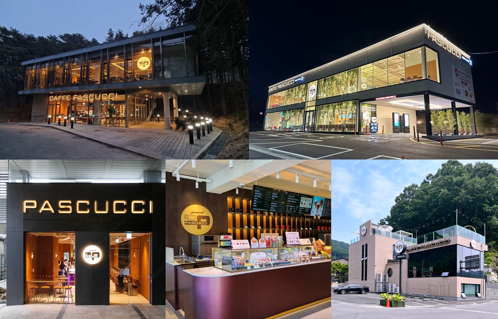 Clockwise from top left: Pascucci Centro Seoul National University, Pascucci Daejeon Shintanjin DT, Pascucci Daecheong Dam, Pascucci Yeosu Seonsodaegyo Bridge, and Pascucci Expresso Bar Yangjae