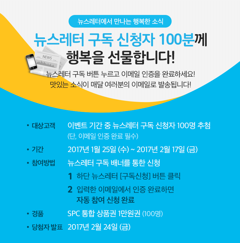 함께 보기 좋은 글 SPC MAGAZINE 뉴스레터 구독 신청 이벤트당첨자 발표 SPC MAGAZINE 뉴스레터 구독 신청 이벤트당첨자 발표 SPC MAGAZINE 뉴스레터 구독 신청 이벤트당첨자 발표 Tags: SPC그룹SPC이벤트뉴스레터뉴스레터구독이벤트Post navigationPreviousPrevious post:파리바게뜨 미주사업부 담당자NextNext post:A.S.I. 소믈리에 디플로마 클래스 수료식