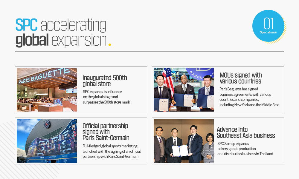 SPC expanded its scope of activities to the international stage this year and solidified its position as a global brand. Starting with its entry into China in 2004, it has steadily expanded its global business and entered 10 countries, including the U.S., France, the U.K., Canada, and Singapore. In particular, Paris Baguette has surpassed the milestone of opening its 500th global store. In addition, in November, we became the first domestic company to sign an official partnership with Paris Saint-Germain, a popular French soccer club, and continued various marketing activities by fully launching sports marketing in line with strengthening our global business.